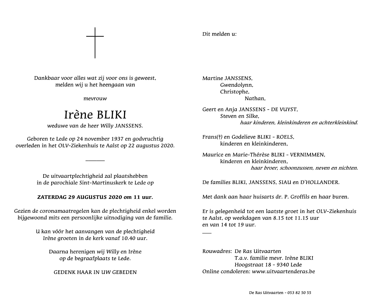 Irene Bliki Geboren: 24 november 1937 27 27 — Lede Overleden: 22 augustus 2020 — Lede |
