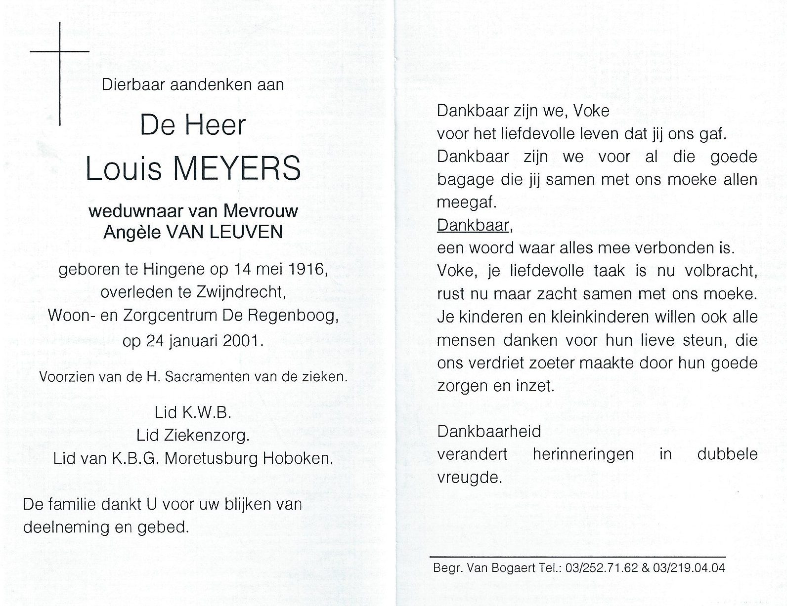 Louis Meyers Geboren: 14 april 1916 — Hingene Overleden: 24 januari 2001 — Zwijndrecht |