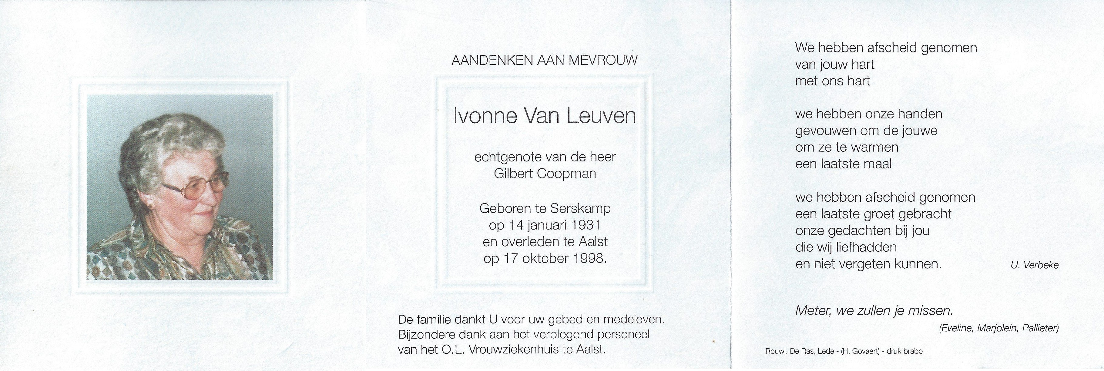 Overlijden van een echtgenote | Ivonne Van Leuven 17 oktober 1998 (Leeftijd 76 jaar) |