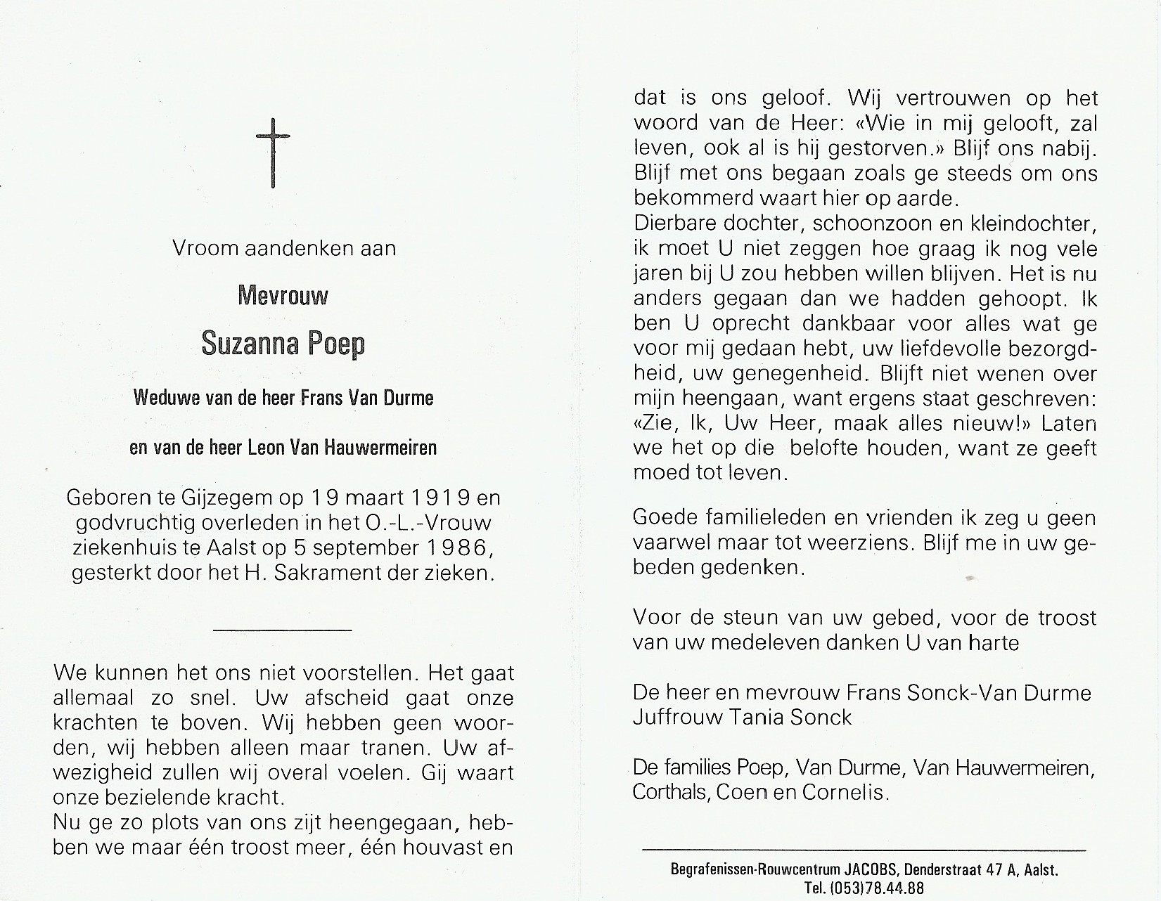 Suzanna Poep Geboren: 19 maart 1919 — Gijzegem Overleden: 5 september 1986 — Aalst |