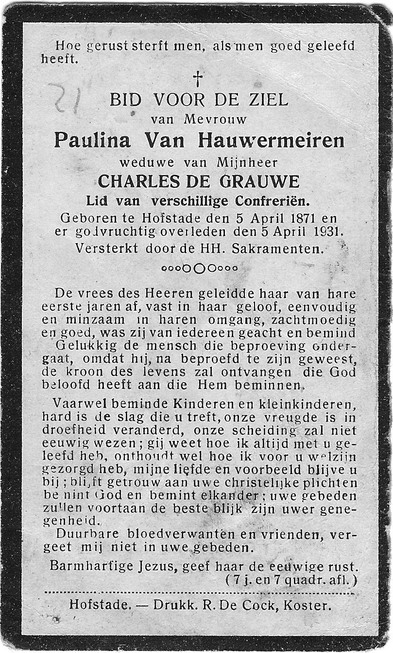 Maria Paulina Van Hauwermeiren Geboren: 5 april 1871 36 25 — Hofstade Overleden: 5 april 1931 — Hofstade |