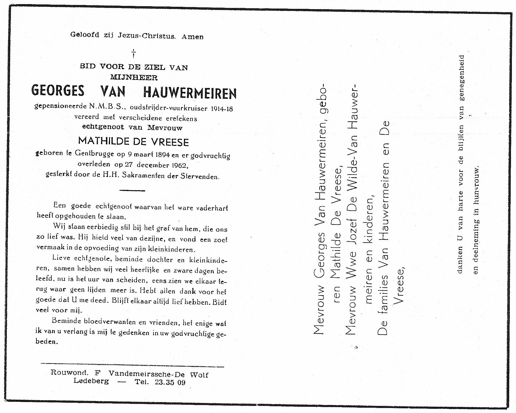 Georgius Augustinus Van Hauwermeiren Geboren: 9 maart 1894 34 33 — Gentbrugge Overleden: 27 december 1962 — Gentbrugge |
