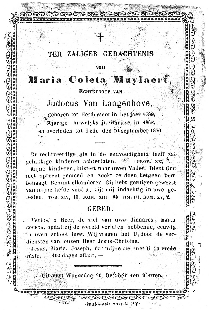 Overlijden van grootmoeder van moeders kant | Maria Coleta Muylaert 10 september 1870 (Leeftijd 17 jaar) |