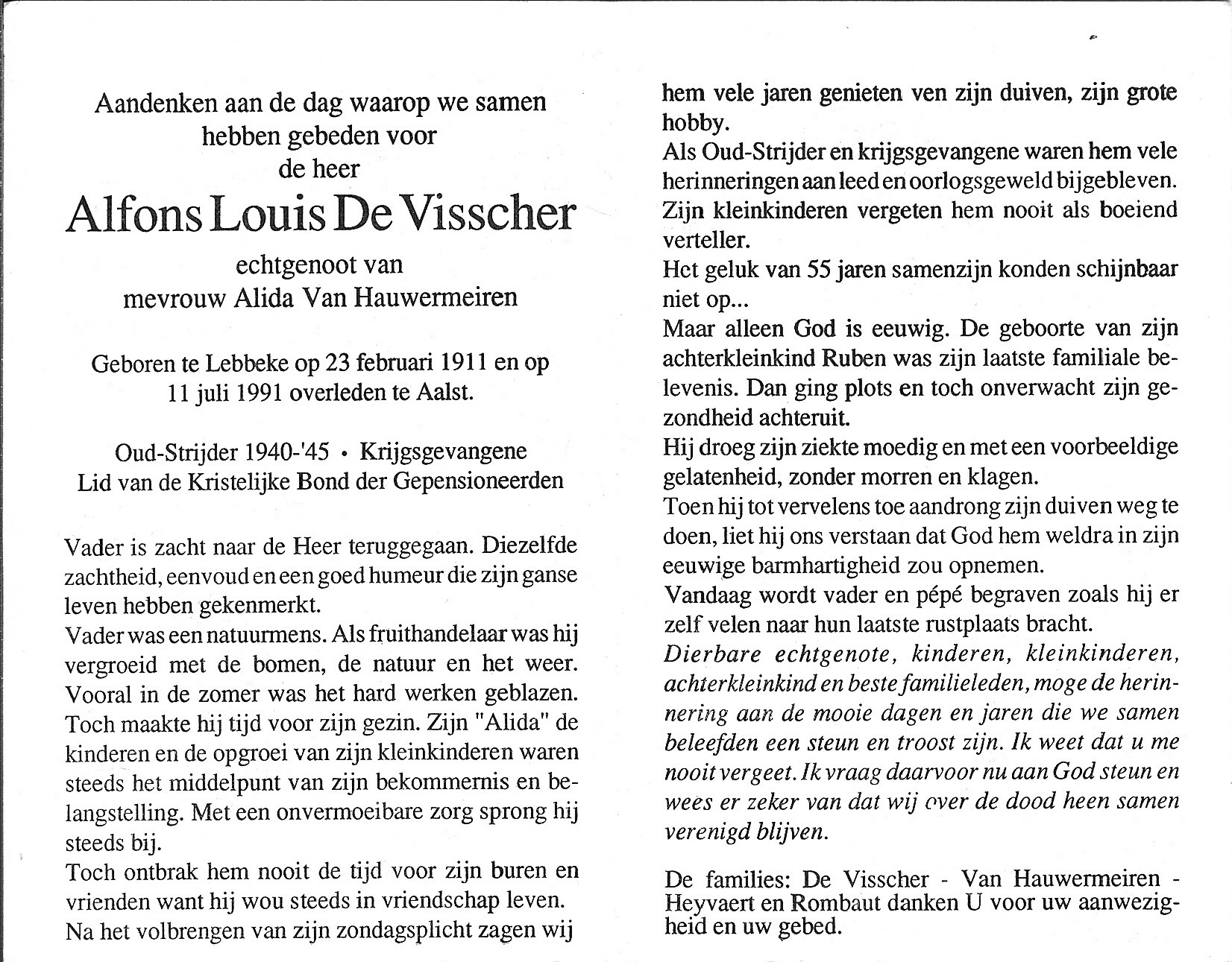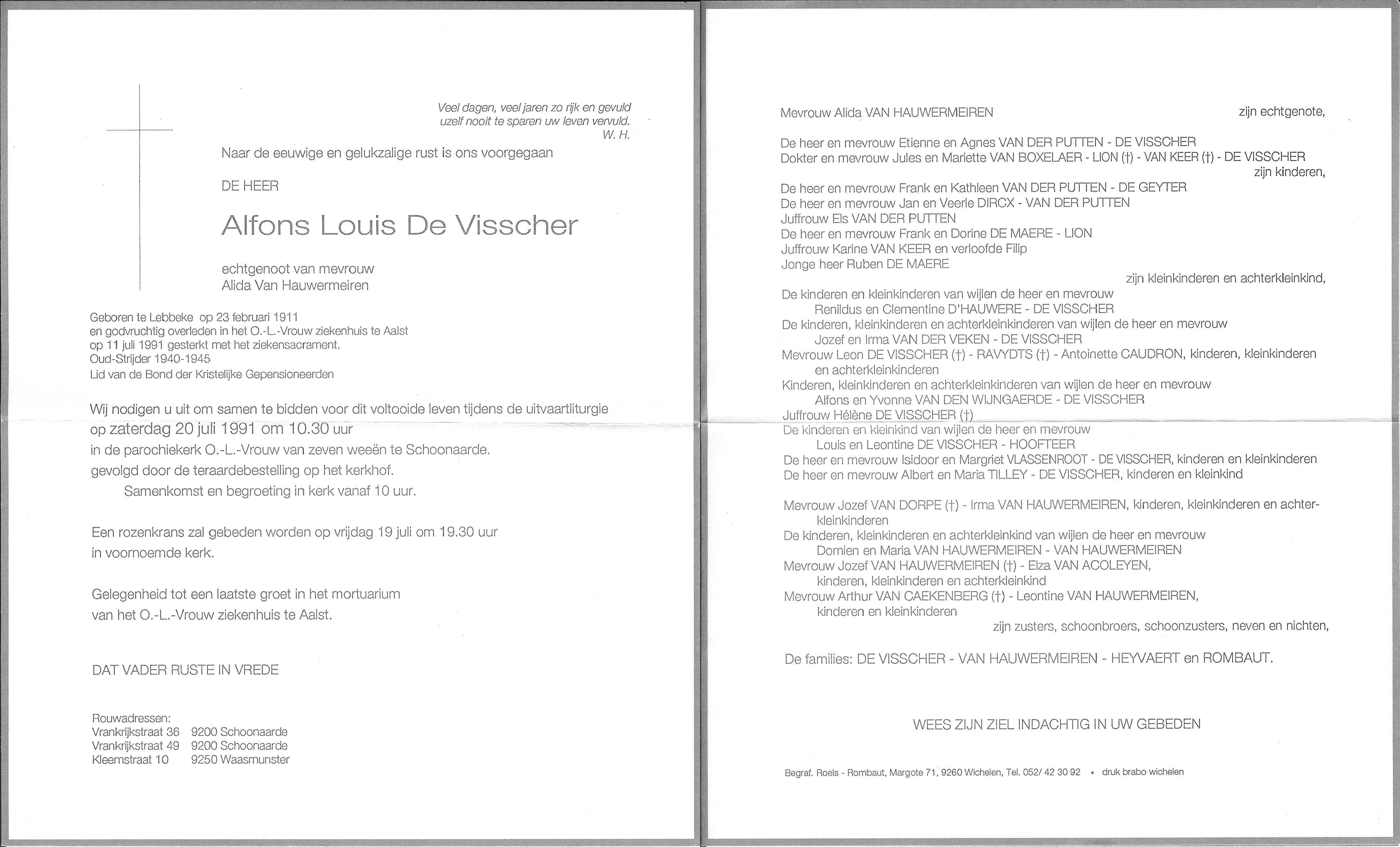 Begrafenis van een echtgenoot | Alfons Louis De Visscher 20 juli 1991 (Leeftijd 85 jaar) |