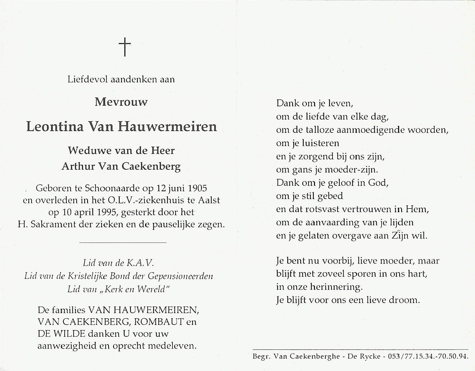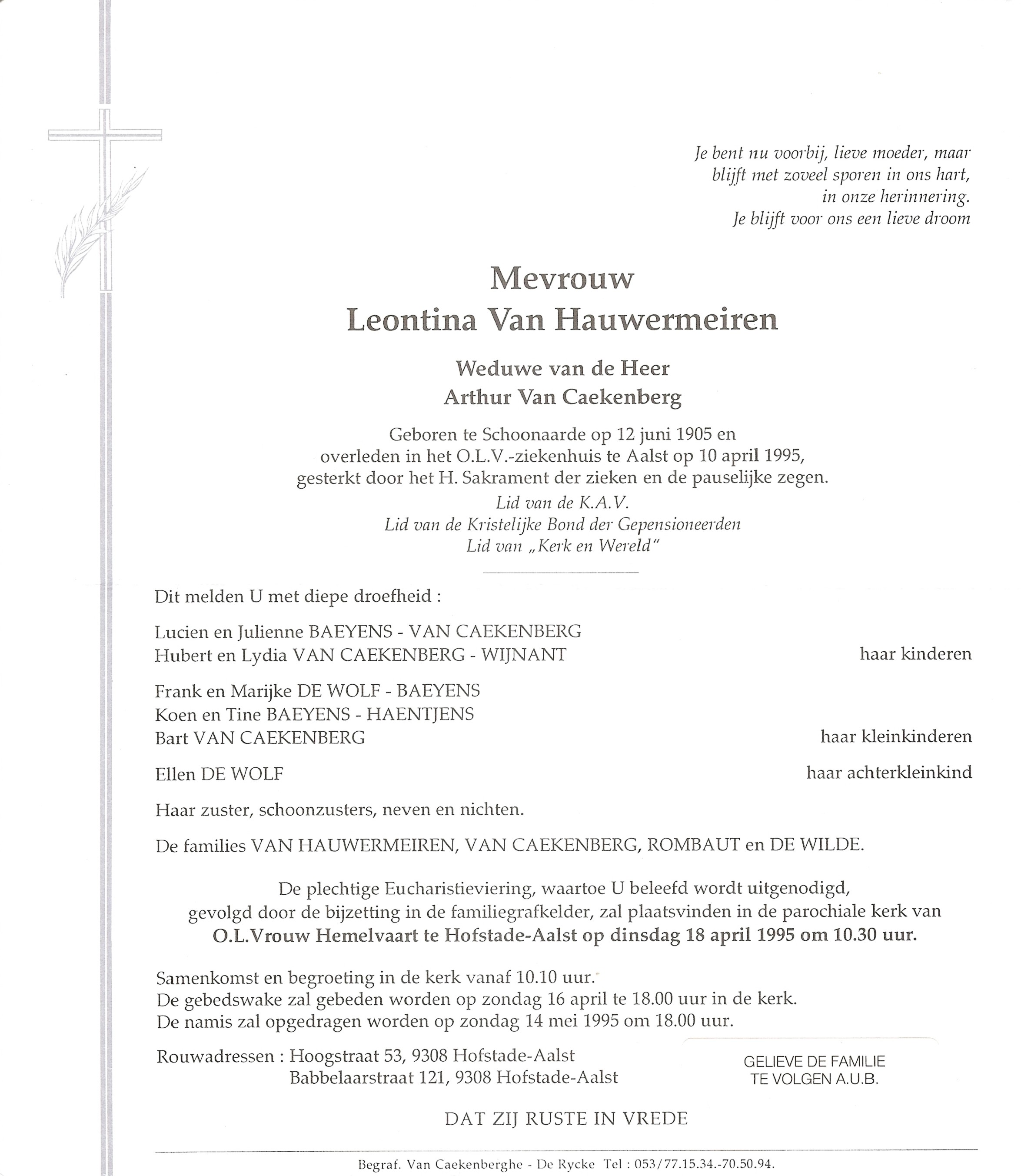 Begrafenis van een zus | Leontina Maria Van Hauwermeiren 18 april 1995 (Leeftijd 88 jaar) |