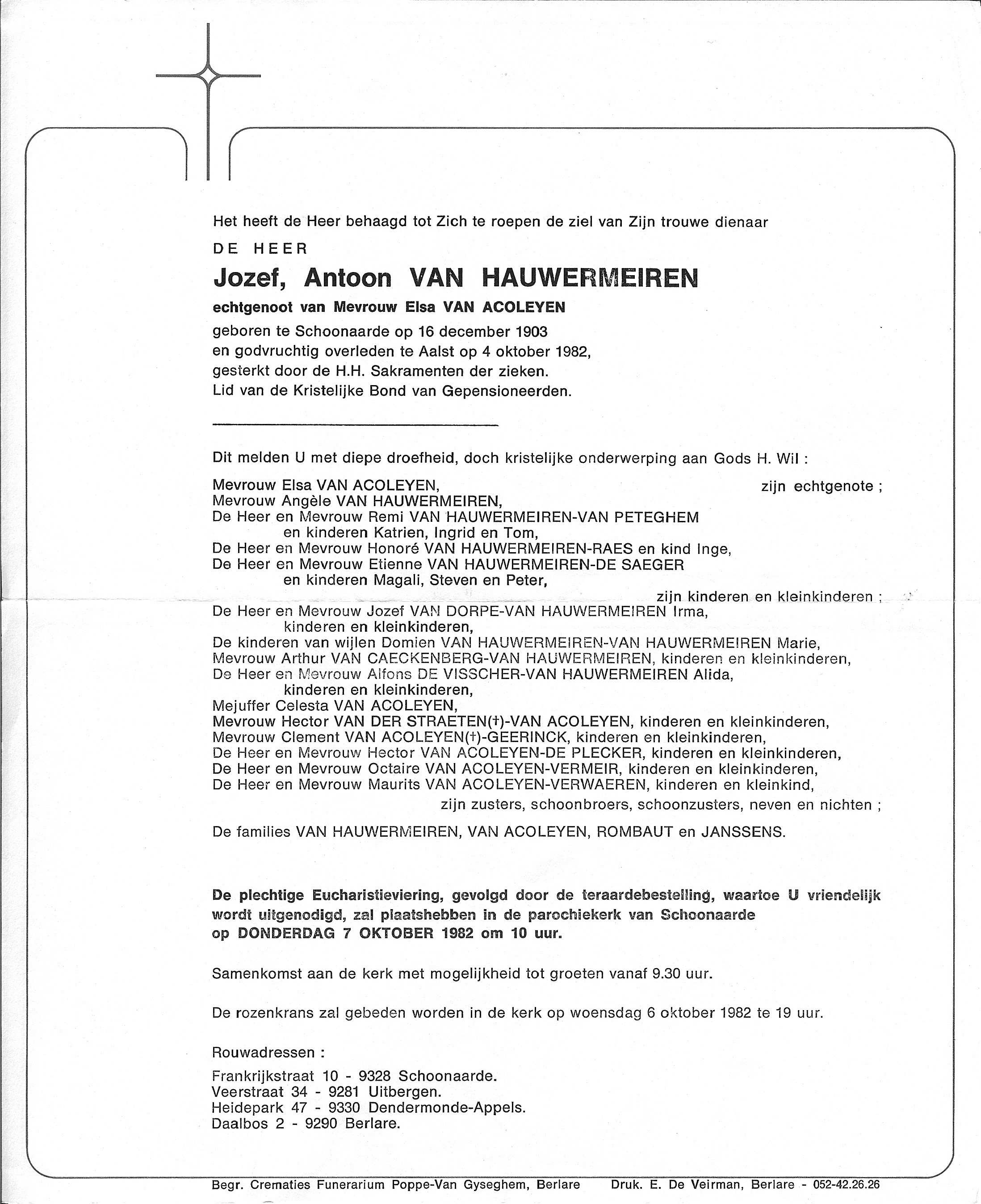 Begrafenis van een broer | Joseph Antonius Van Hauwermeiren 7 oktober 1982 (Leeftijd 76 jaar) |