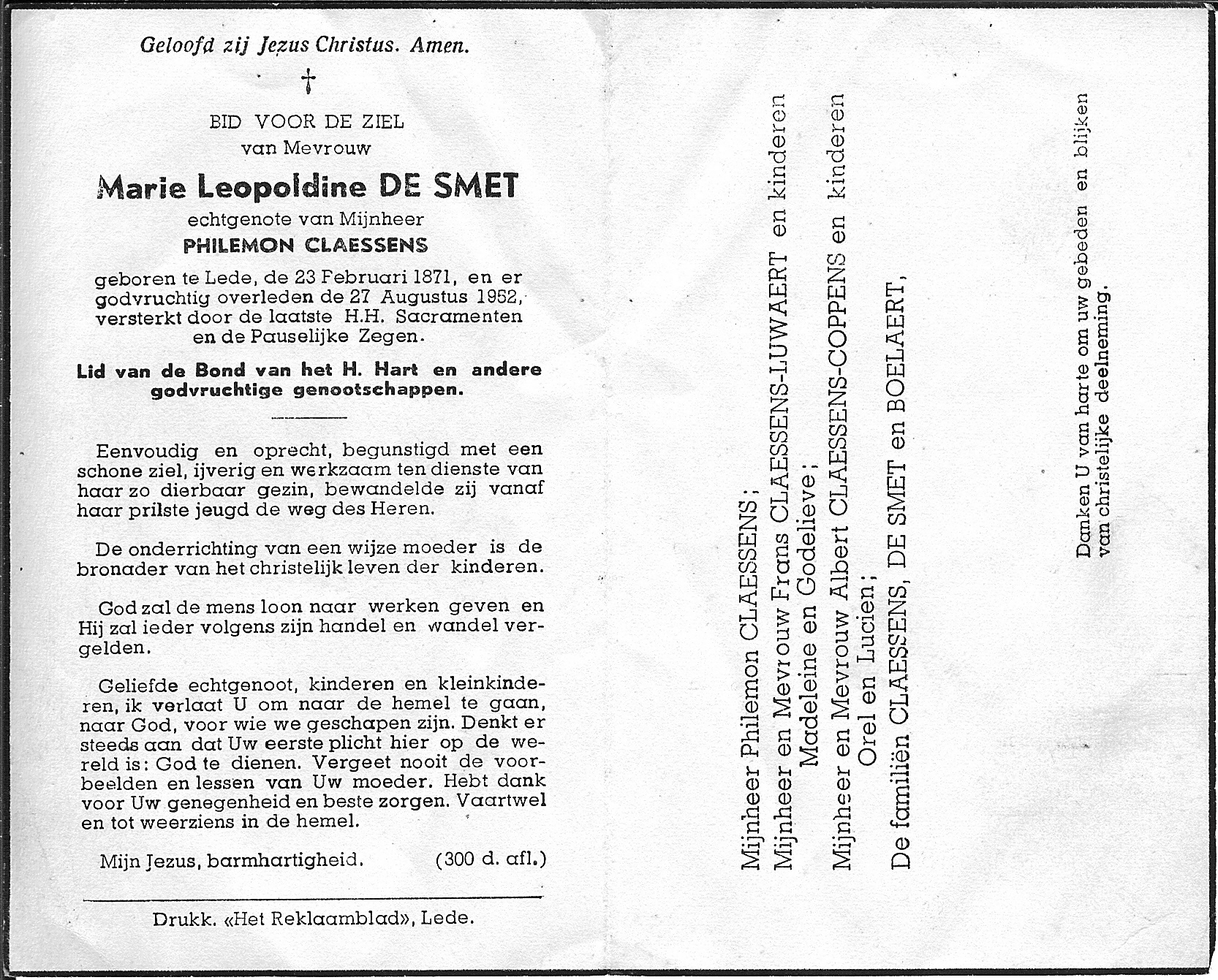 Marie Leopoldine De Smet Geboren: 23 februari 1871 — Lede Overleden: 27 augustus 1952 — Lede |