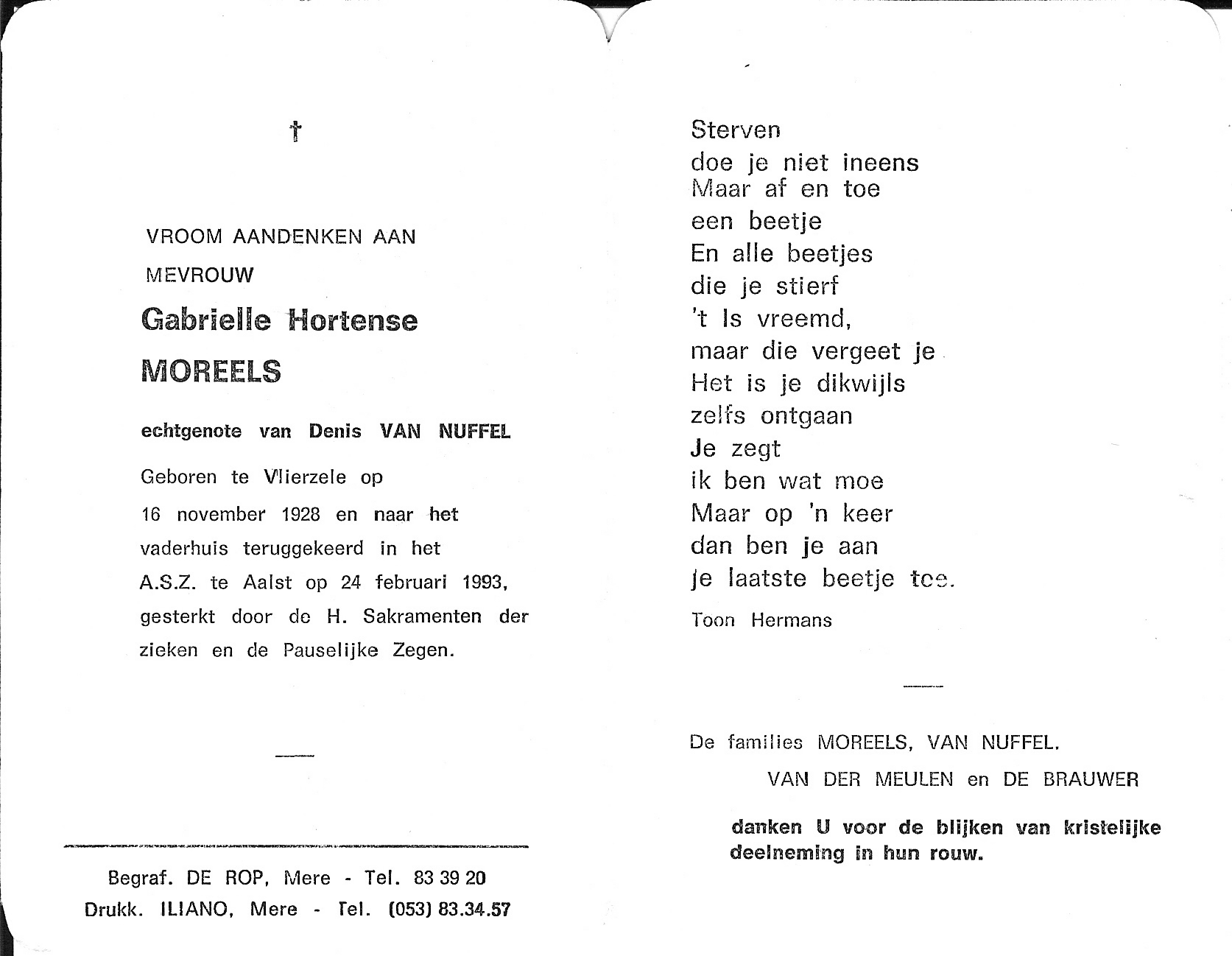 Gabrielle Hortense Moreels Geboren: 16 november 1928 39 31 — Vlierzele Overleden: 24 februari 1993 — Aalst |