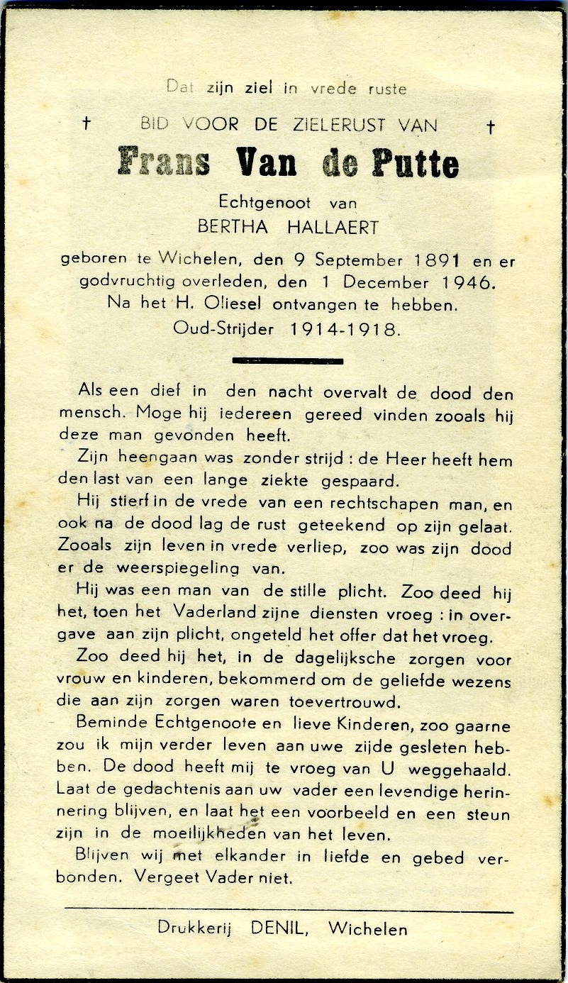 Overlijden van vader | Franciscus Van de Putte 1 december 1946 (Leeftijd 21 jaar) |