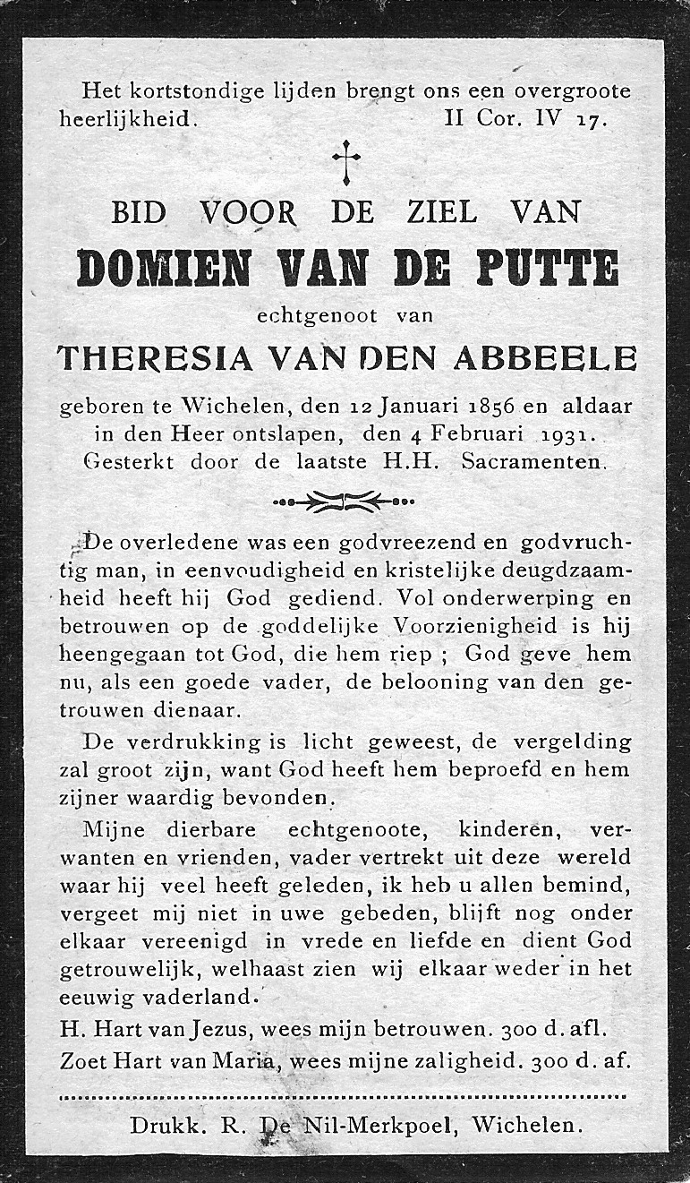 Overlijden van grootvader van vaders kant | Dominicus Van de Putte 4 februari 1931 (Leeftijd 5 jaar) |