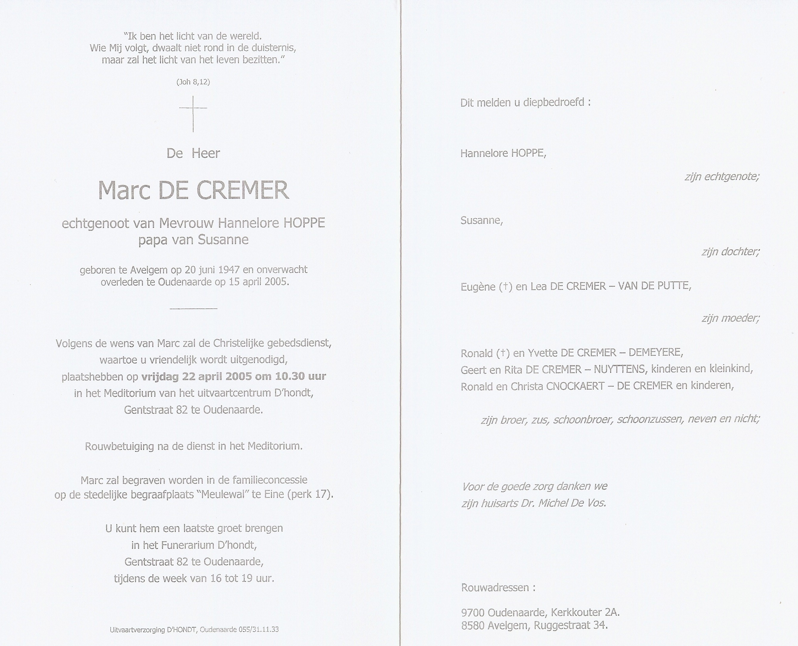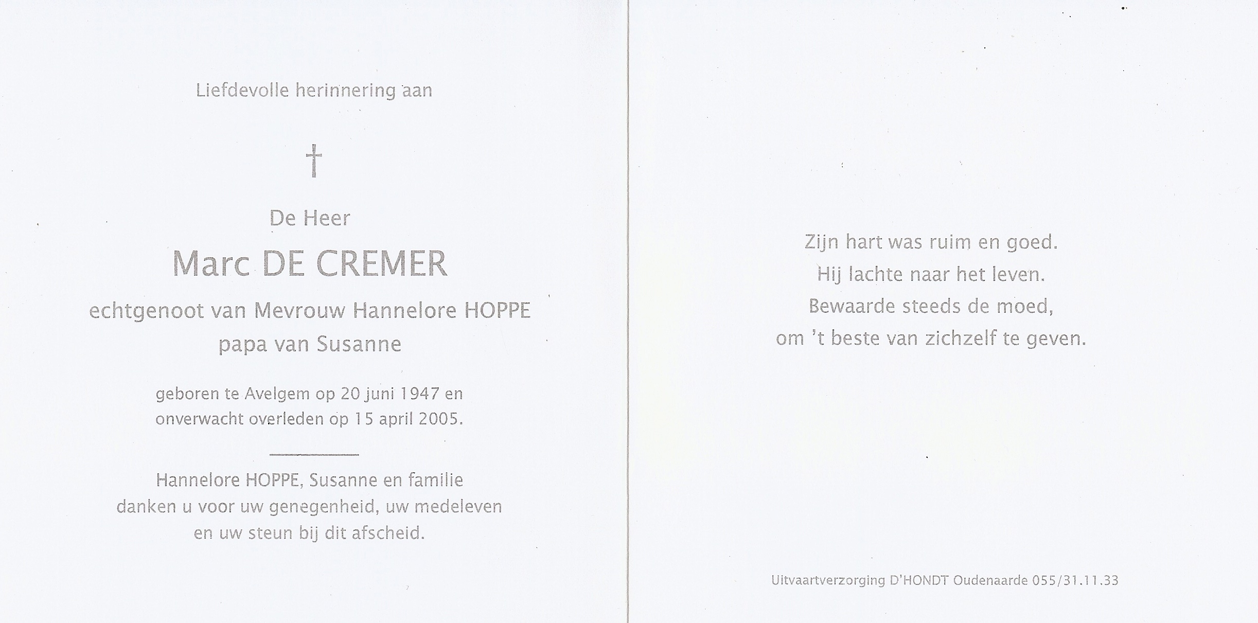 Marc De Cremer Geboren: 20 juni 1947 26 24 — Avelgem Overleden: 15 april 2005 — Oudenaarde |