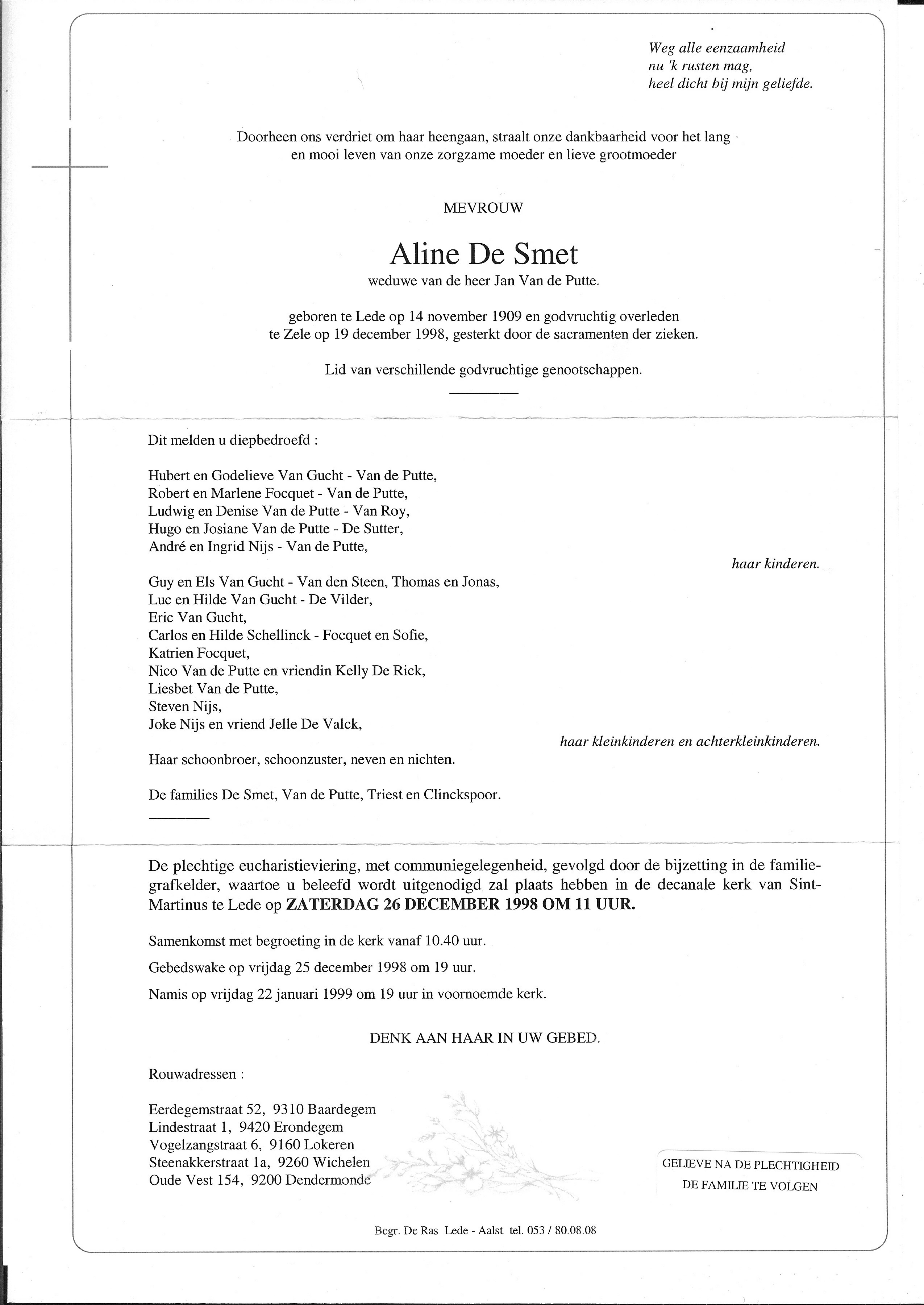 Overlijden van een echtgenoot | Joannes-Baptiste Van de Putte 11 december 1992 (Leeftijd 83 jaar) |