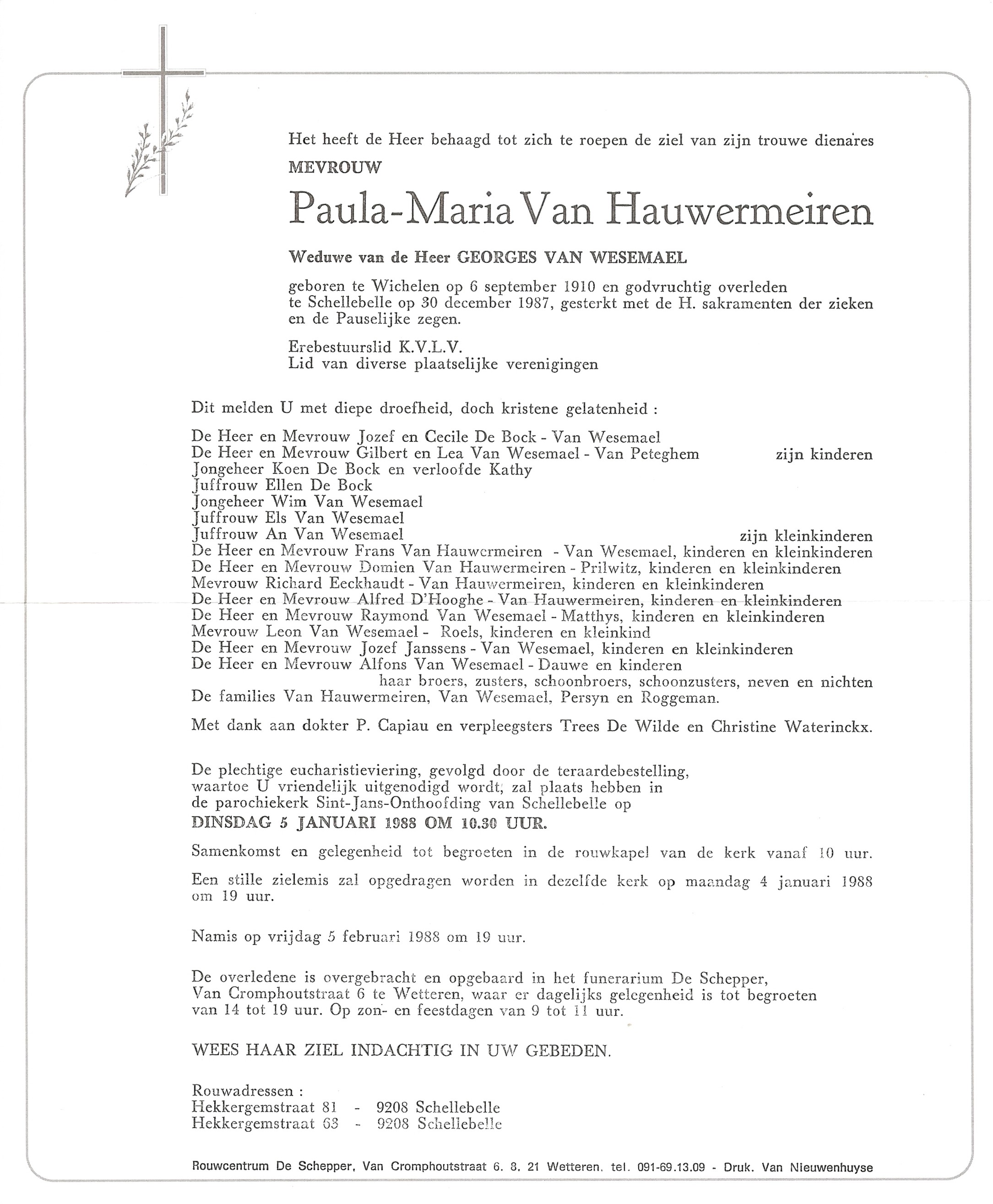Begrafenis van een zus | Paula Maria Frederica Van Hauwermeiren 5 januari 1988 (Leeftijd 75 jaar) |