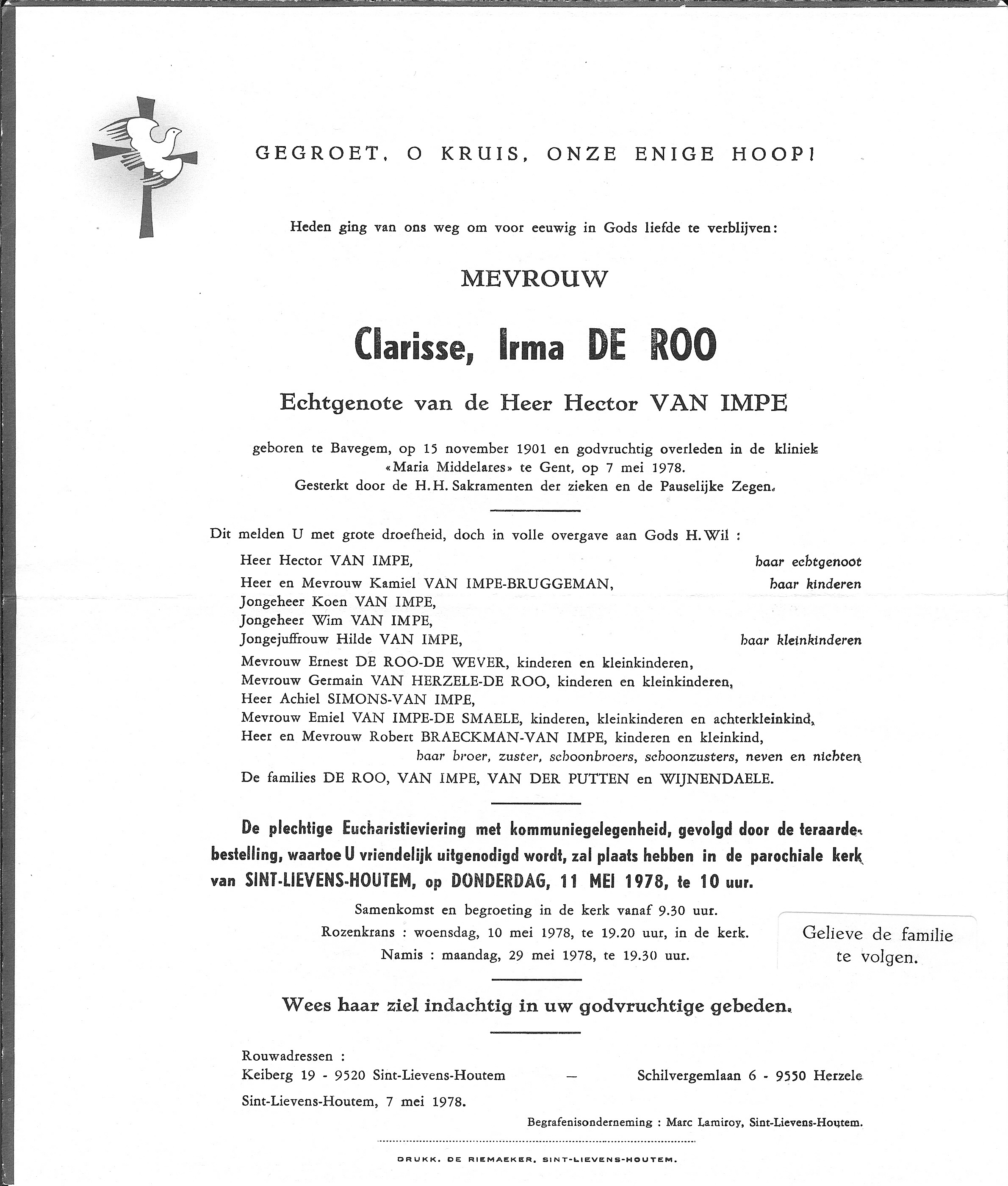 Begrafenis van een zus | Clarisse Irma De Roo 11 mei 1978 (Leeftijd 69 jaar) |