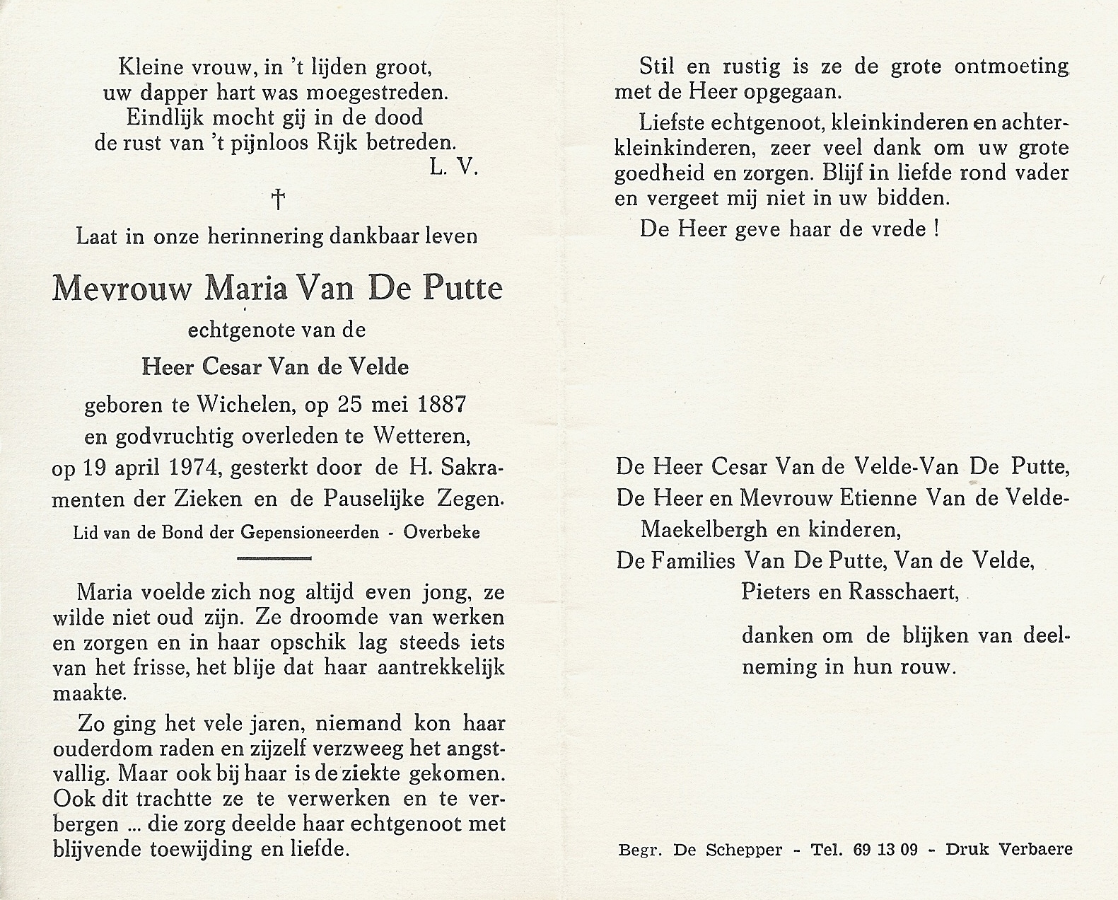 Maria Van de Putte Geboren: 25 mei 1887 31 25 — Wichelen Overleden: 19 april 1974 — Wetteren |
