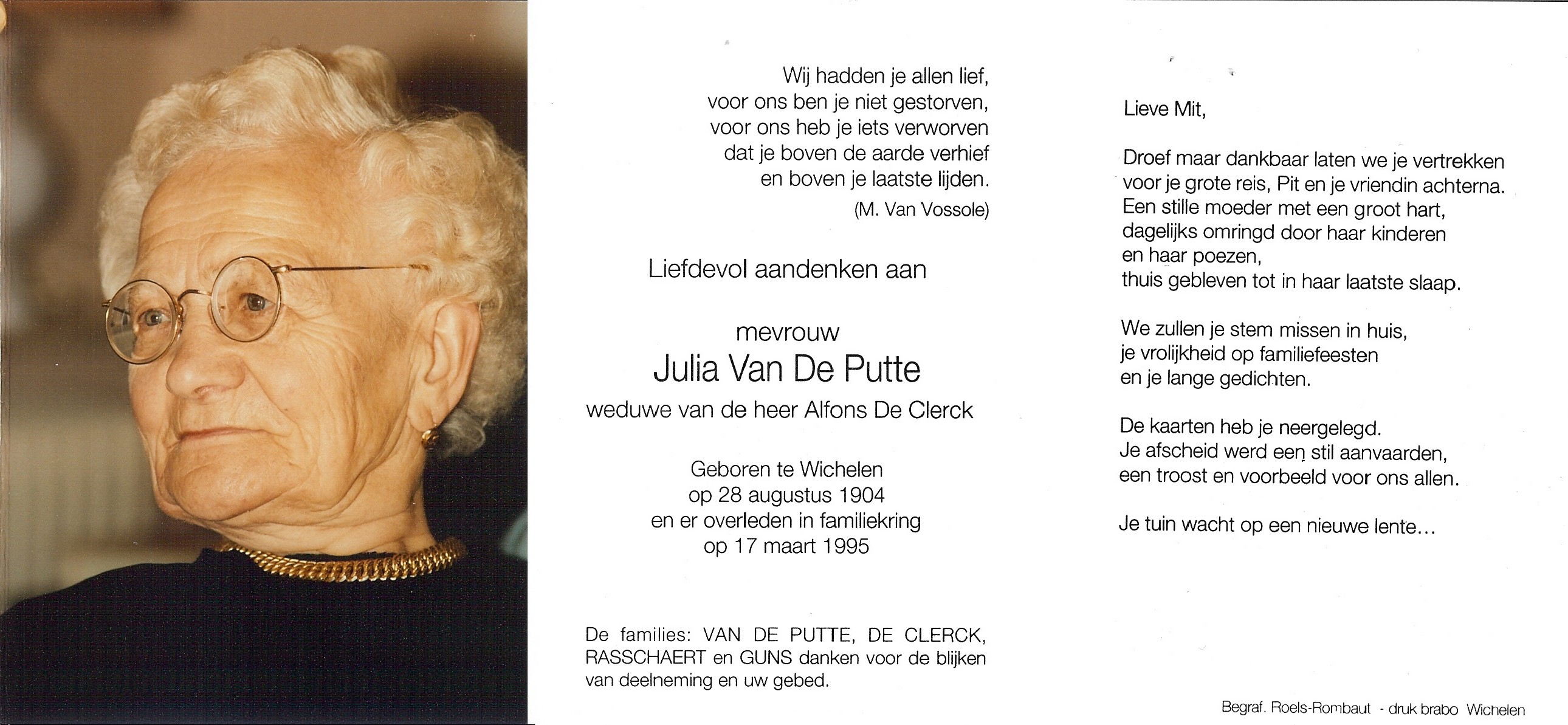 Begrafenis van moeder | Julia Pelagia Van de Putte 25 maart 1995 (Leeftijd 58 jaar) |