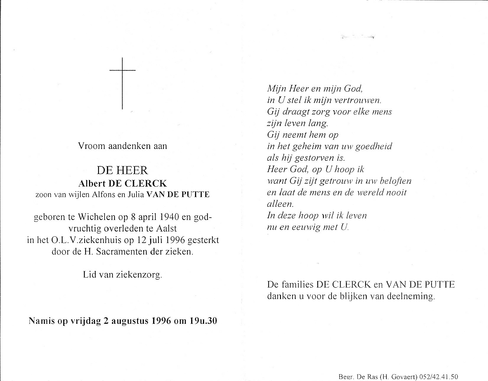 Begrafenis van een broer | Albert De Clerck 20 juli 1996 (Leeftijd 59 jaar) |