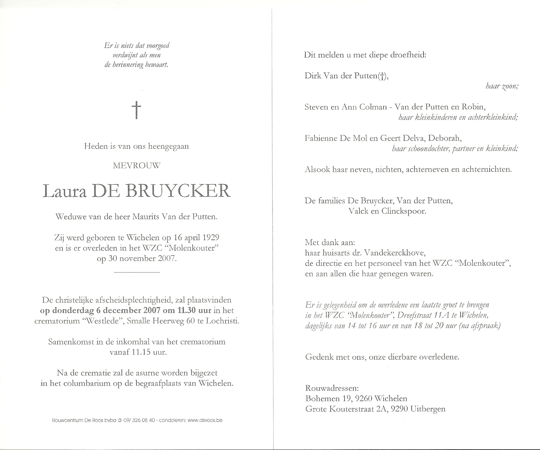 Overlijden van een echtgenoot | Maurits Domien Van der Putten 4 november 1985 (Leeftijd 56 jaar) |