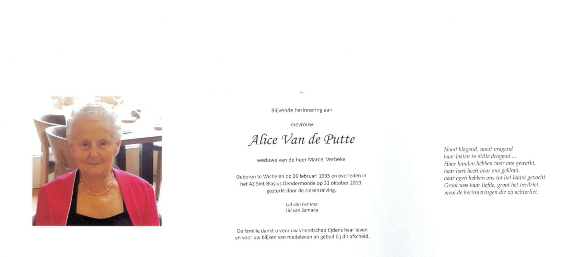 Alice Godelieve Van de PutteLeeftijd: 84 jaar1935–2019