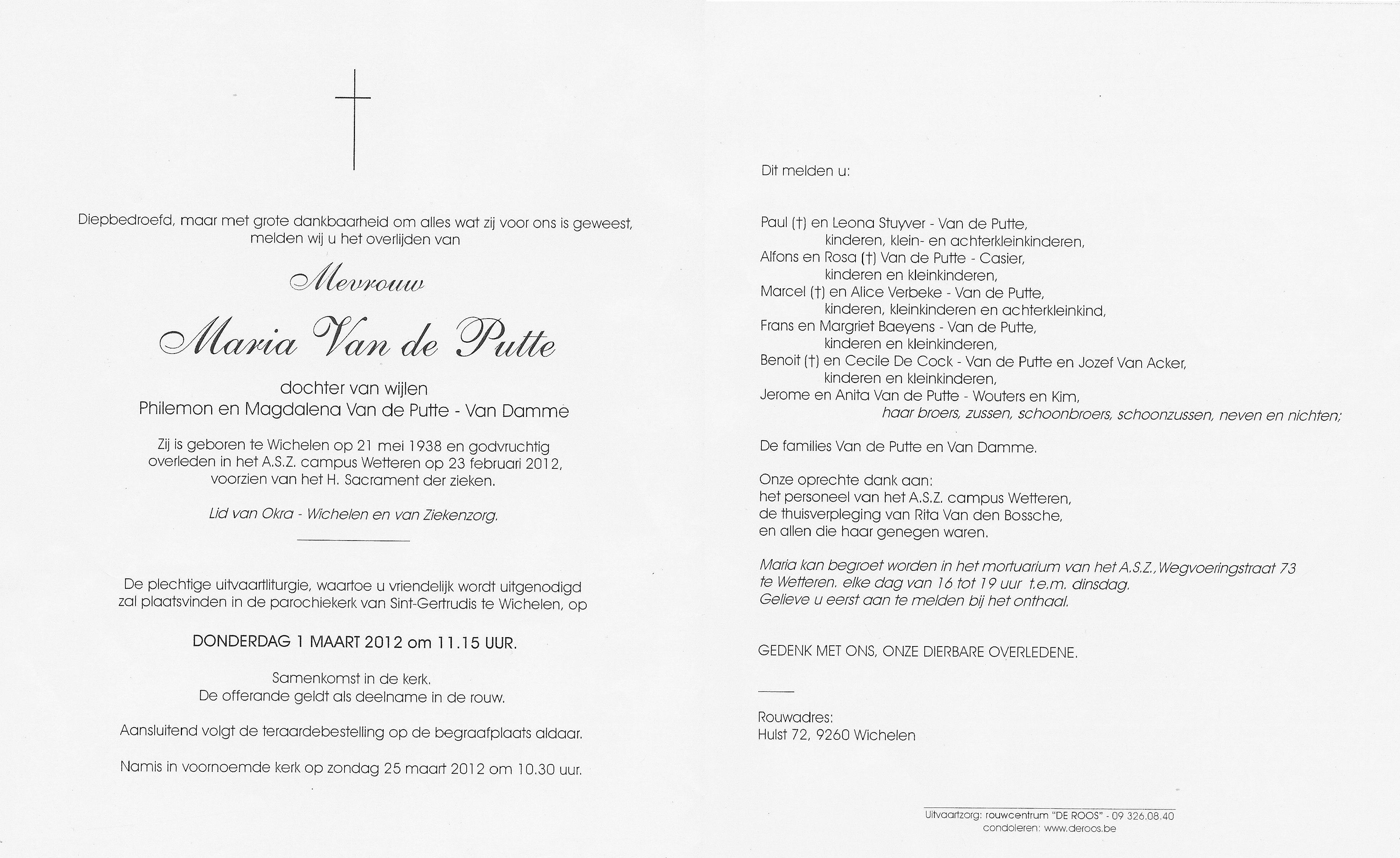 Begrafenis van een zus | Maria Van de Putte 1 maart 2012 (Leeftijd 67 jaar) |