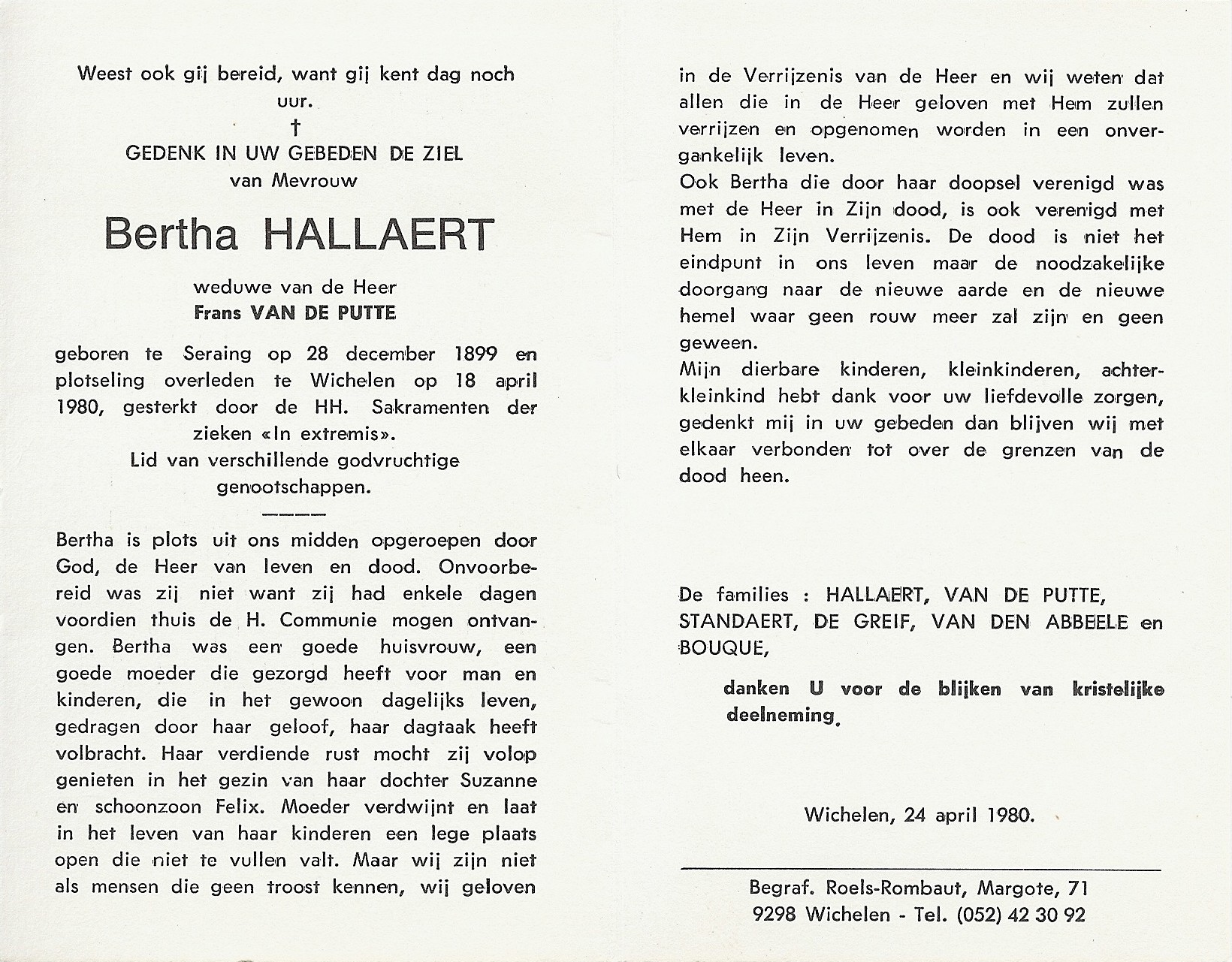 Overlijden van moeder | Bertha Hallaert 18 april 1980 (Leeftijd 50 jaar) |