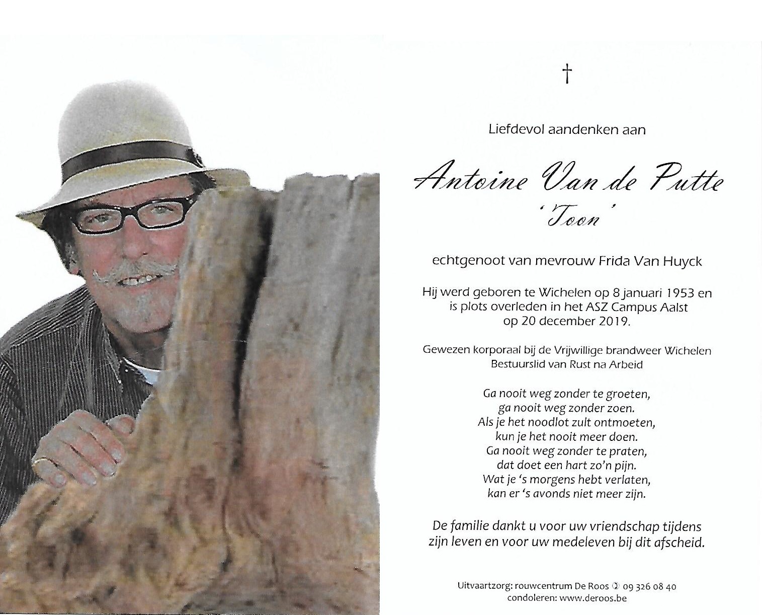 Geboren: 8 januari 1953 47 29 — Wichelen Overleden: 20 december 2019 — Aalst |