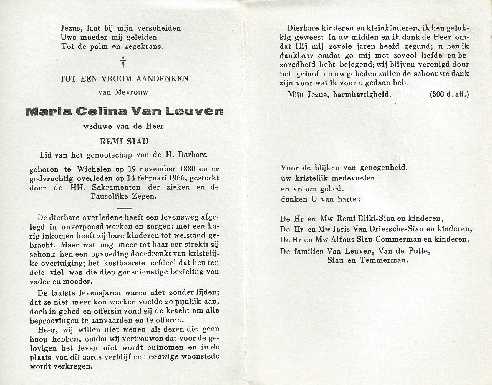 Maria Celina Van Leuven Geboren: 19 november 1880 27 25 — Wichelen Overleden: 14 februari 1966 — Wichelen |
