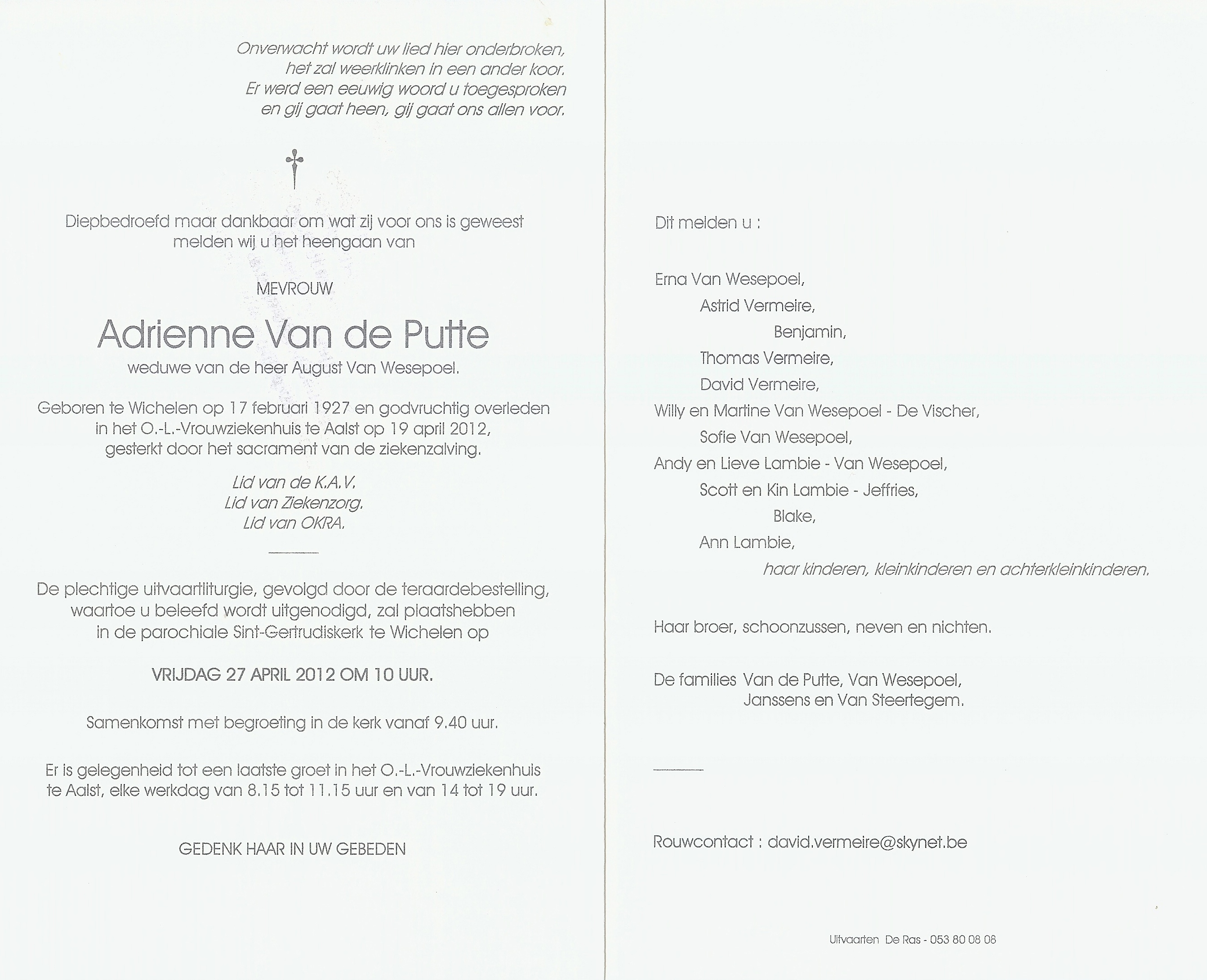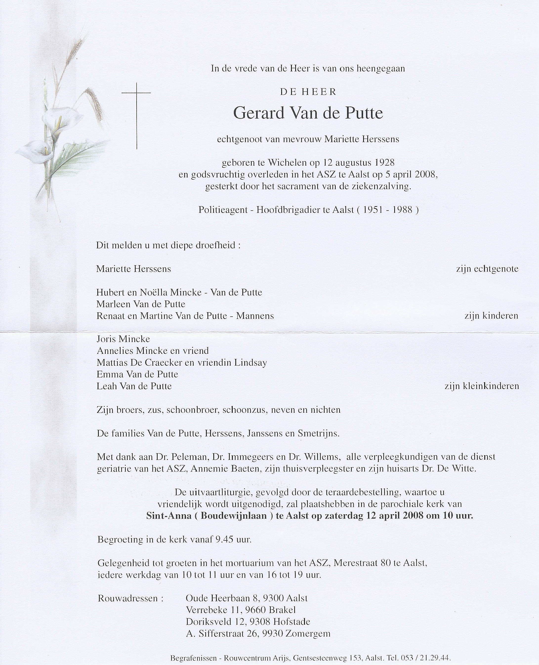 Begrafenis van een broer | Gerardus Gustaaf Van de Putte 12 april 2008 (Leeftijd 81 jaar) |