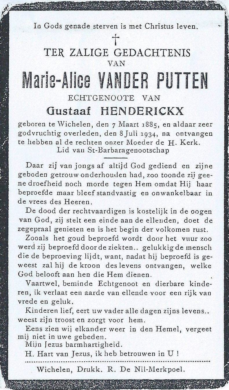Rosalie Van der Putten Geboren: 7 oktober 1880 23 25 — Wichelen Overleden: 30 december 1962 — Wichelen |