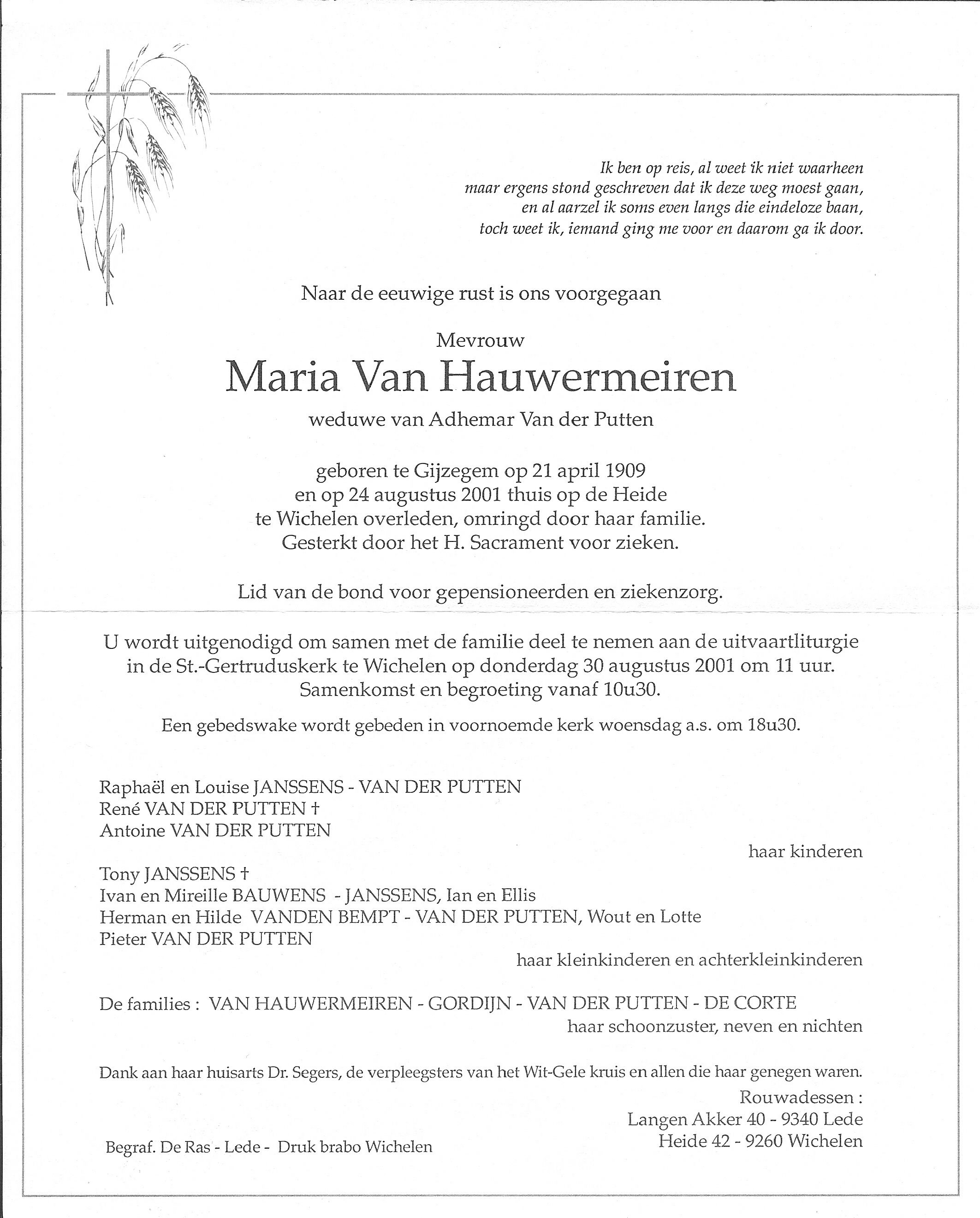 Overlijden van een broer | Hector Van Hauwermeiren 22 november 1993 (Leeftijd 84 jaar) |