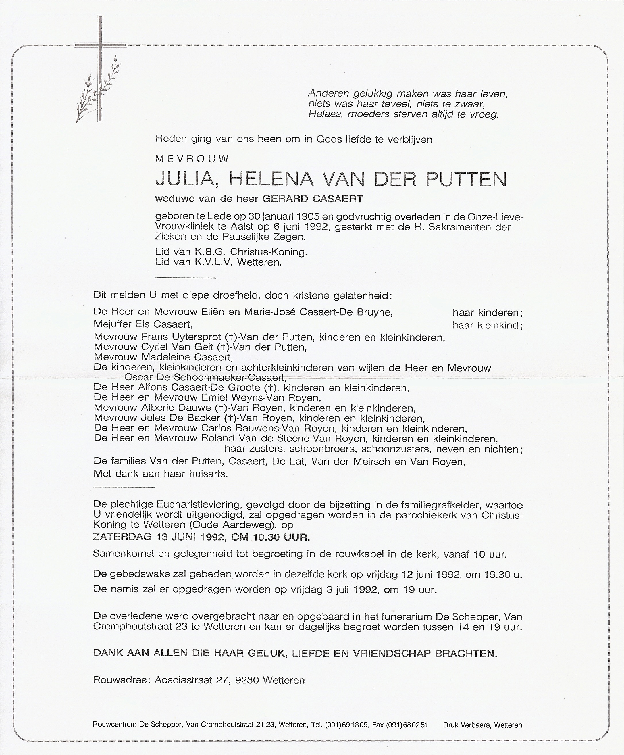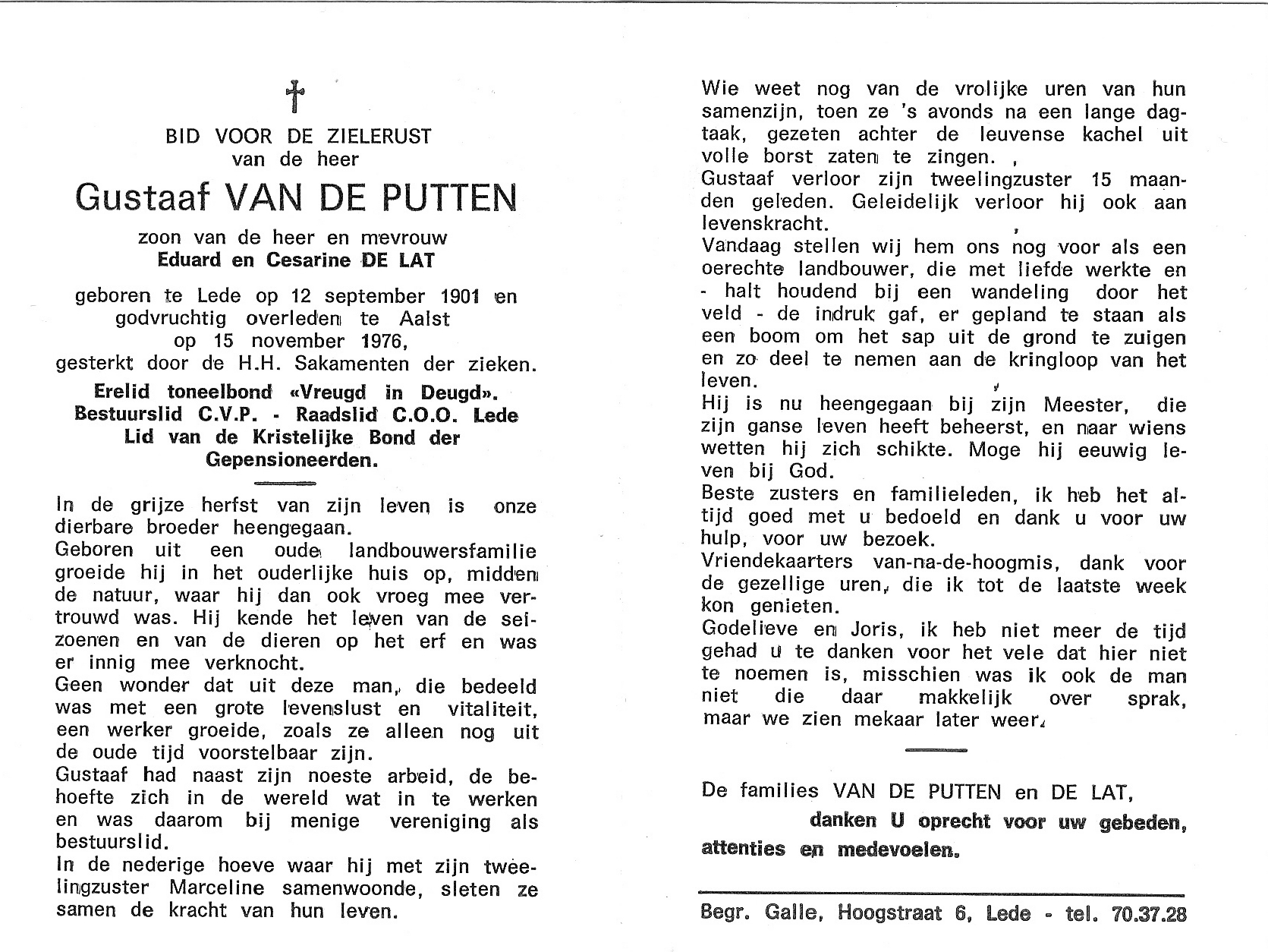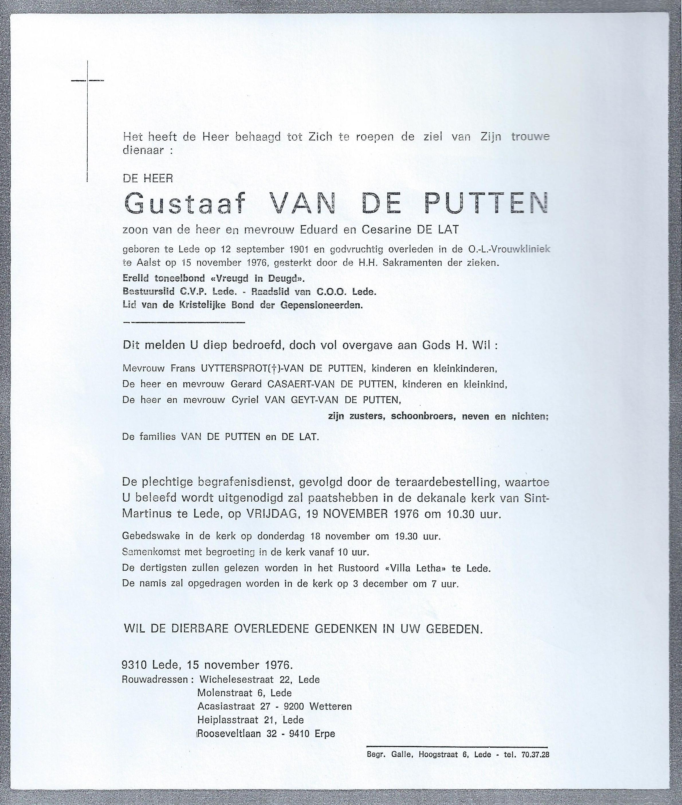 Overlijden van een broer | Gustavus Josephus Van der Putten 15 november 1976 (Leeftijd 70 jaar) |
