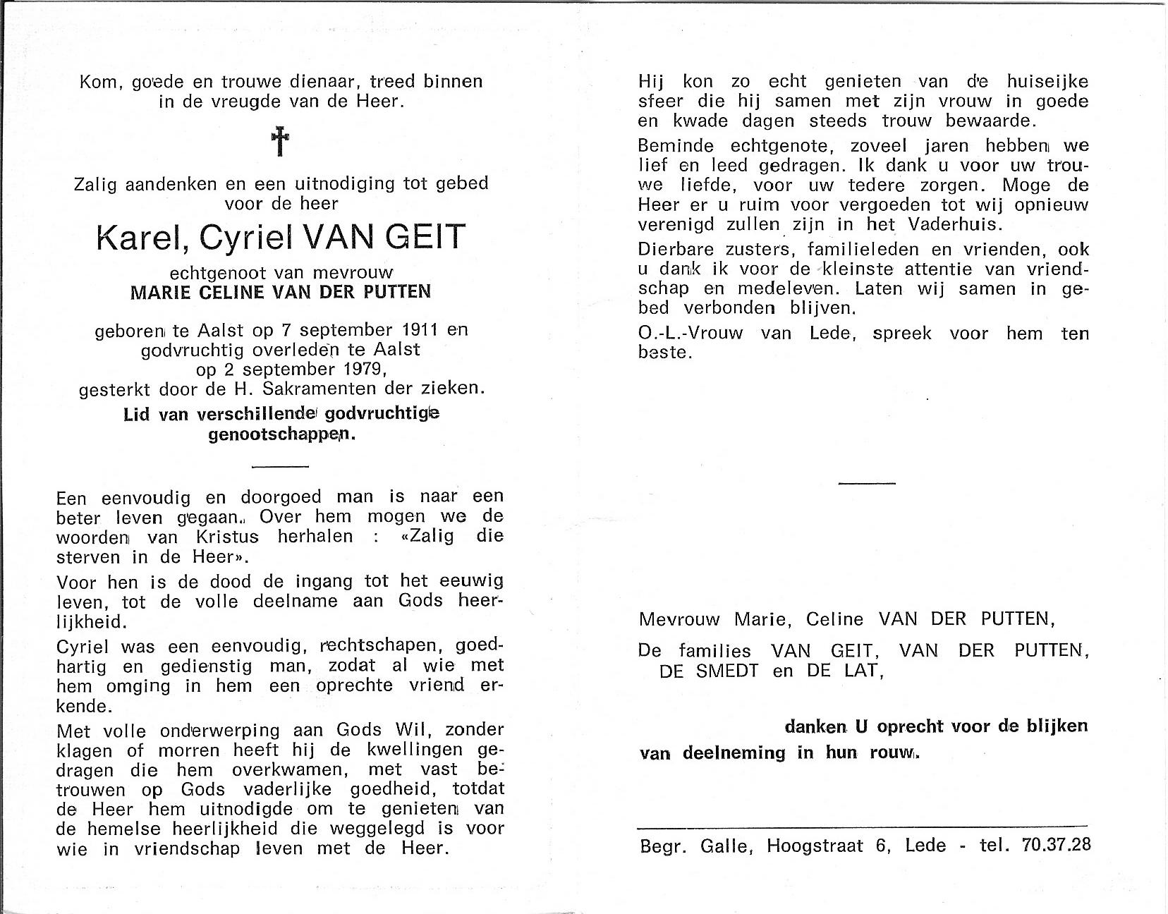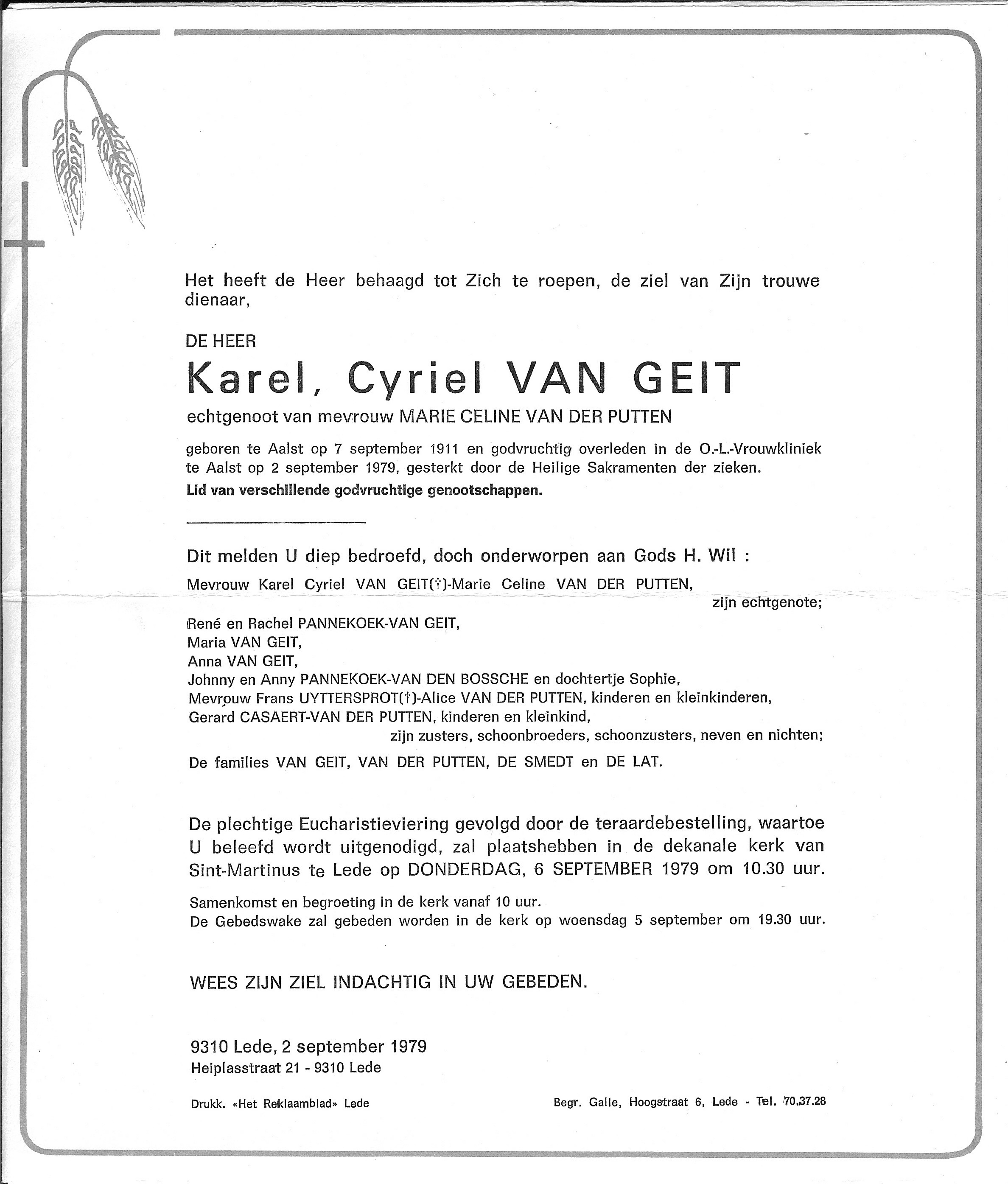 Begrafenis van een echtgenoot | Karel Cyriel Van Geit 6 september 1979 (Leeftijd 73 jaar) |