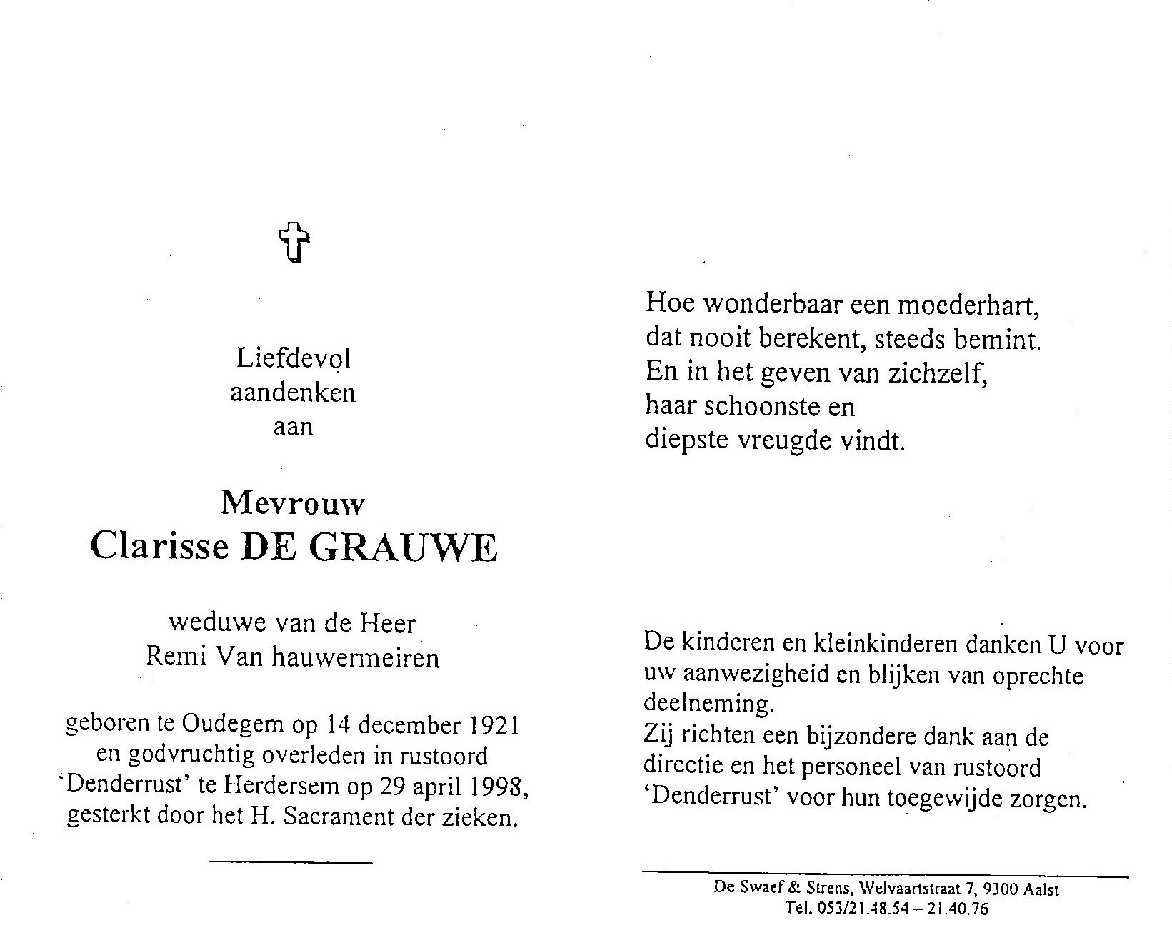 Clarisse De Grauwe Geboren: 14 december 1921 — Oudegem Overleden: 29 april 1998 — Herdersem |