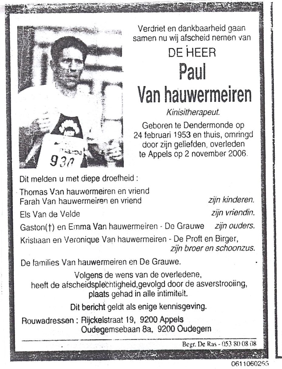 Paul Casimir Van Hauwermeiren Geboren: 24 februari 1953 28 — Dendermonde Overleden: 2 november 2006 — Appels |