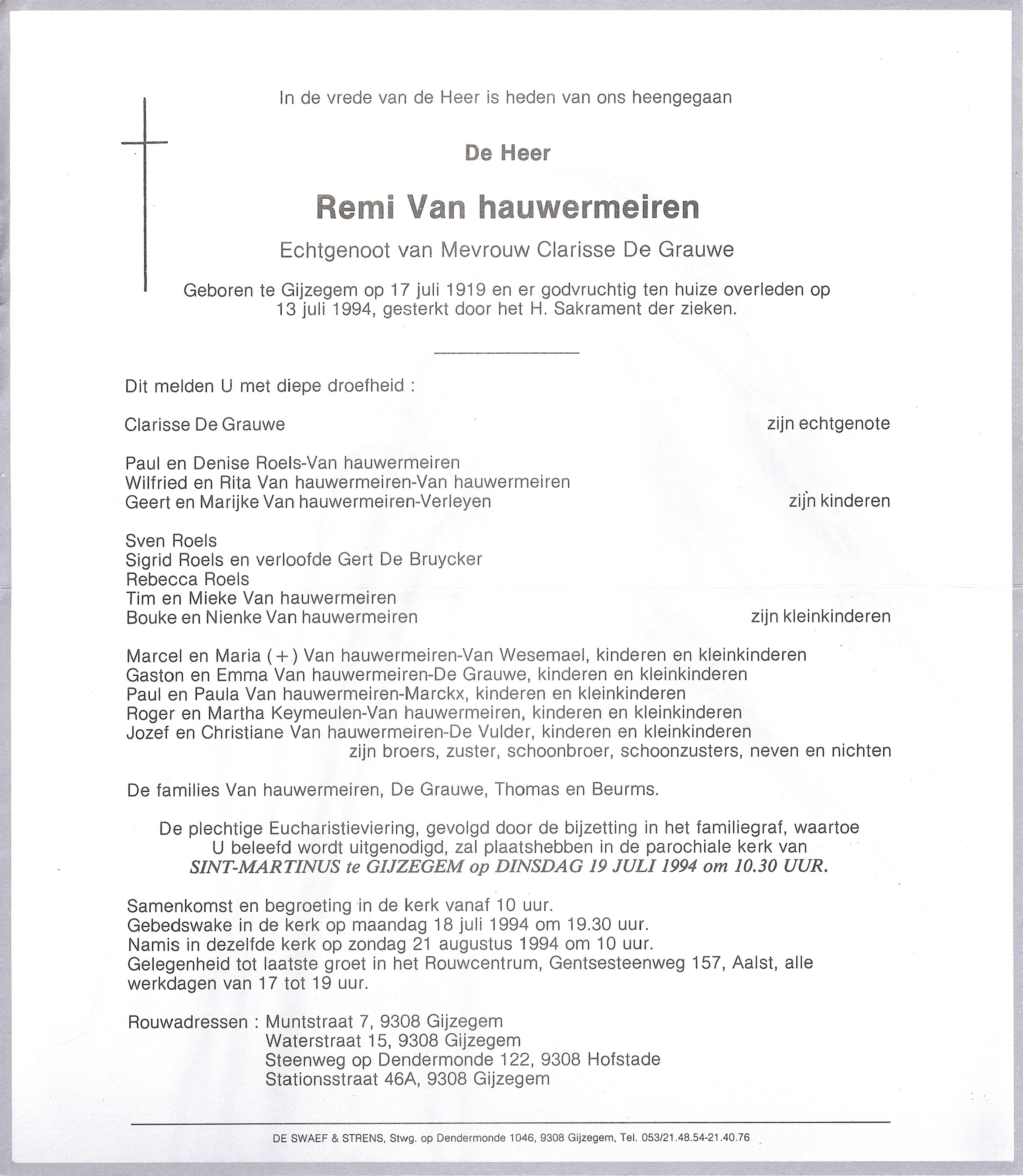 Romanus Clement Remi Van Hauwermeiren Geboren: 17 juli 1919 38 21 — Gijzegem Overleden: 13 juli 1994 — Gijzegem |