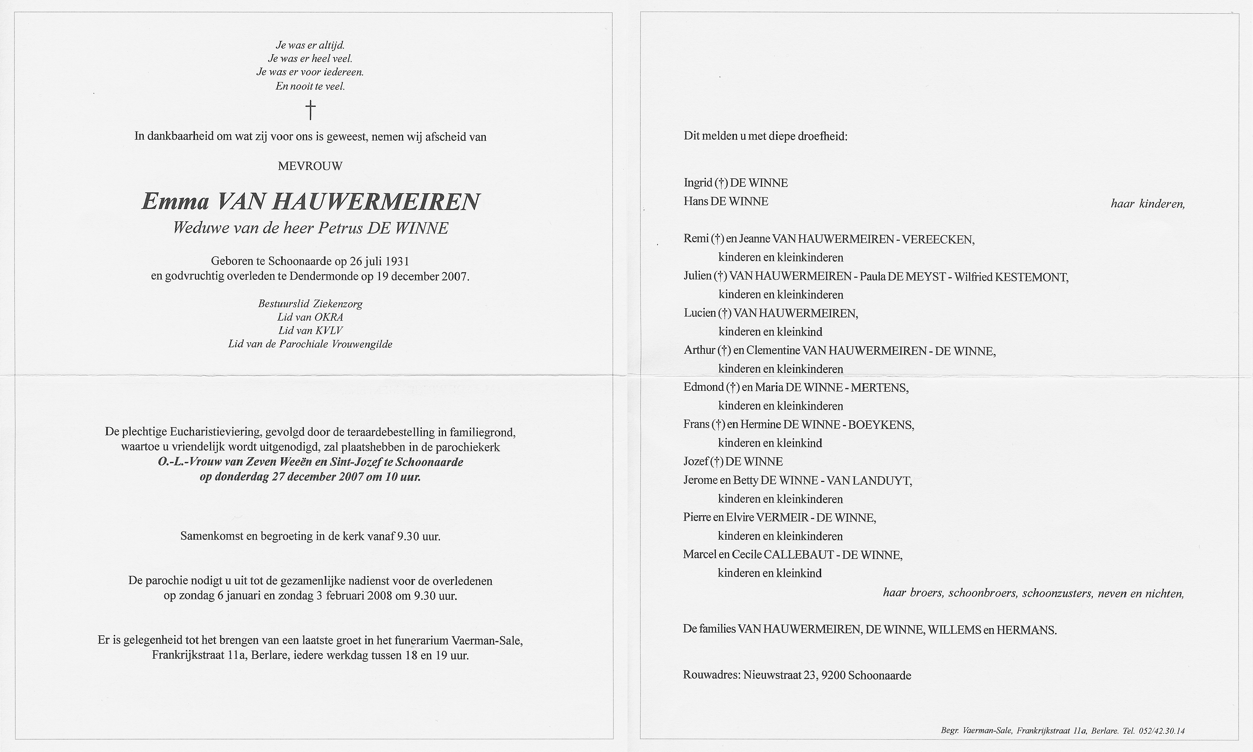 Overlijden van een broer | Remi Van Hauwermeiren 23 februari 2000 (Leeftijd 68 jaar) |
