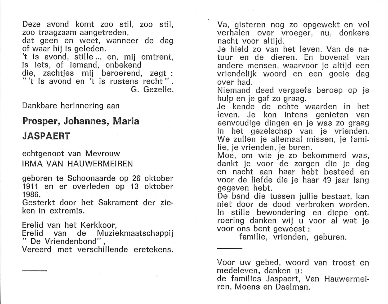 Overlijden van een echtgenoot | Prosper Joannes Maria Jaspaert 13 oktober 1986 (Leeftijd 76 jaar) |