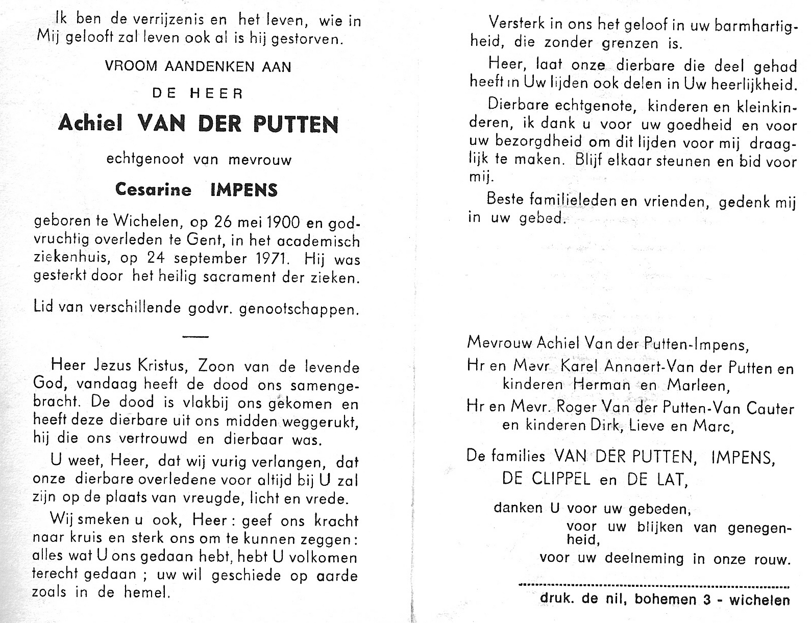 Overlijden van grootvader van moeders kant | Achiel Van der Putten 24 september 1971 (Leeftijd 7 jaar) Adres: n.v.t.