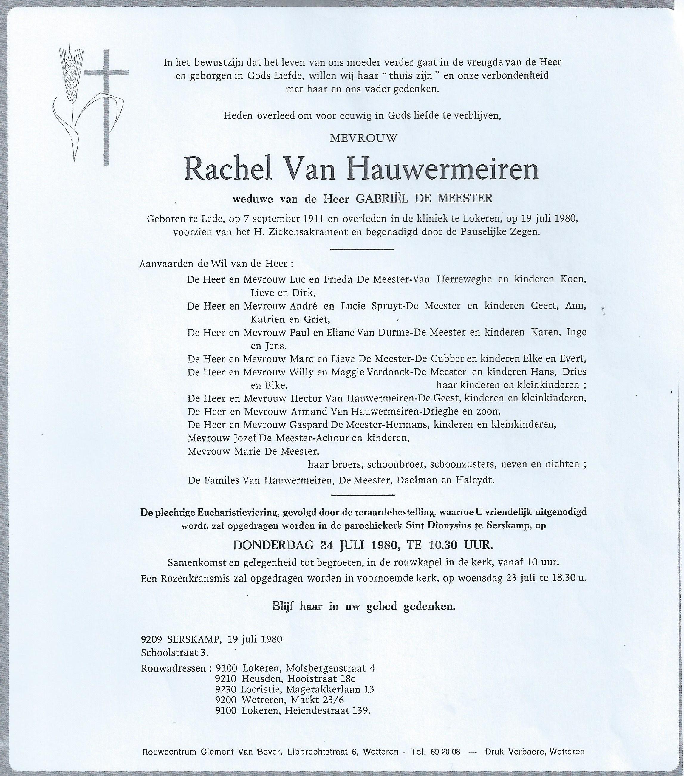 Rachel Van Hauwermeiren Geboren: 7 september 1911 35 27 — Lede Overleden: 19 juli 1980 — Lokeren |