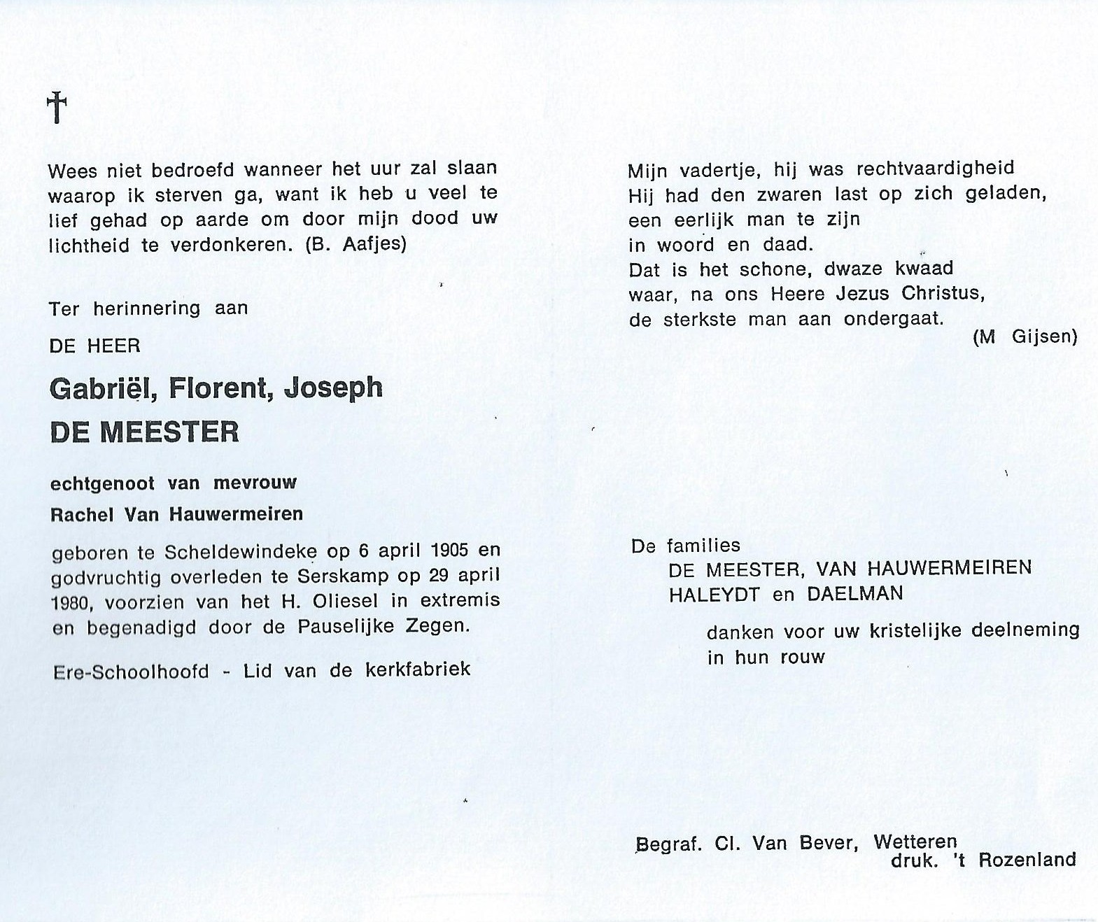 Gabriël Florent Joseph De Meester Geboren: 6 april 1905 — Scheldewindeke Overleden: 29 april 1980 — Serskamp |