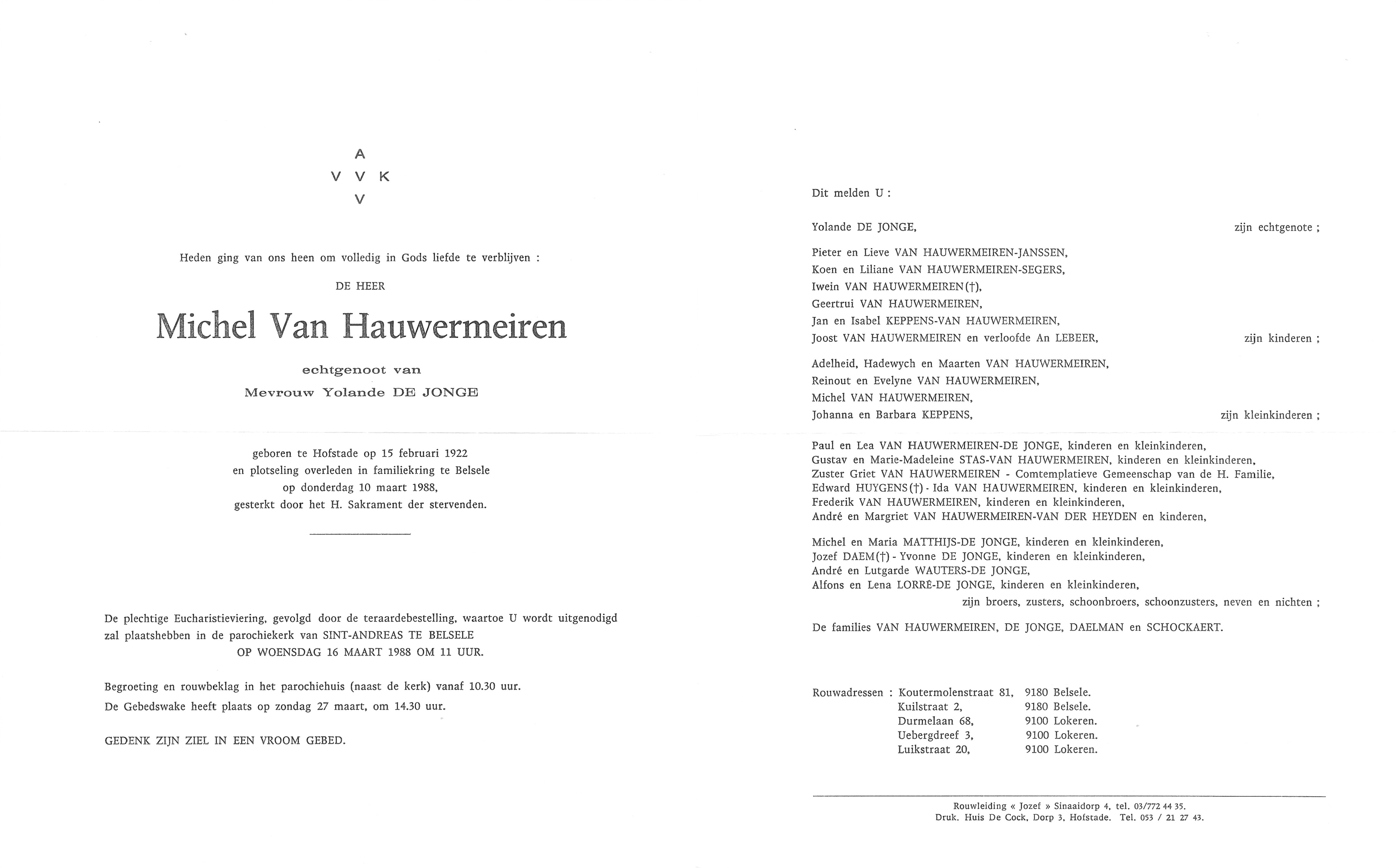 Michel Van Hauwermeiren Geboren: 15 februari 1922 33 28 — Hofstade Overleden: 10 maart 1988 — Belsele |
