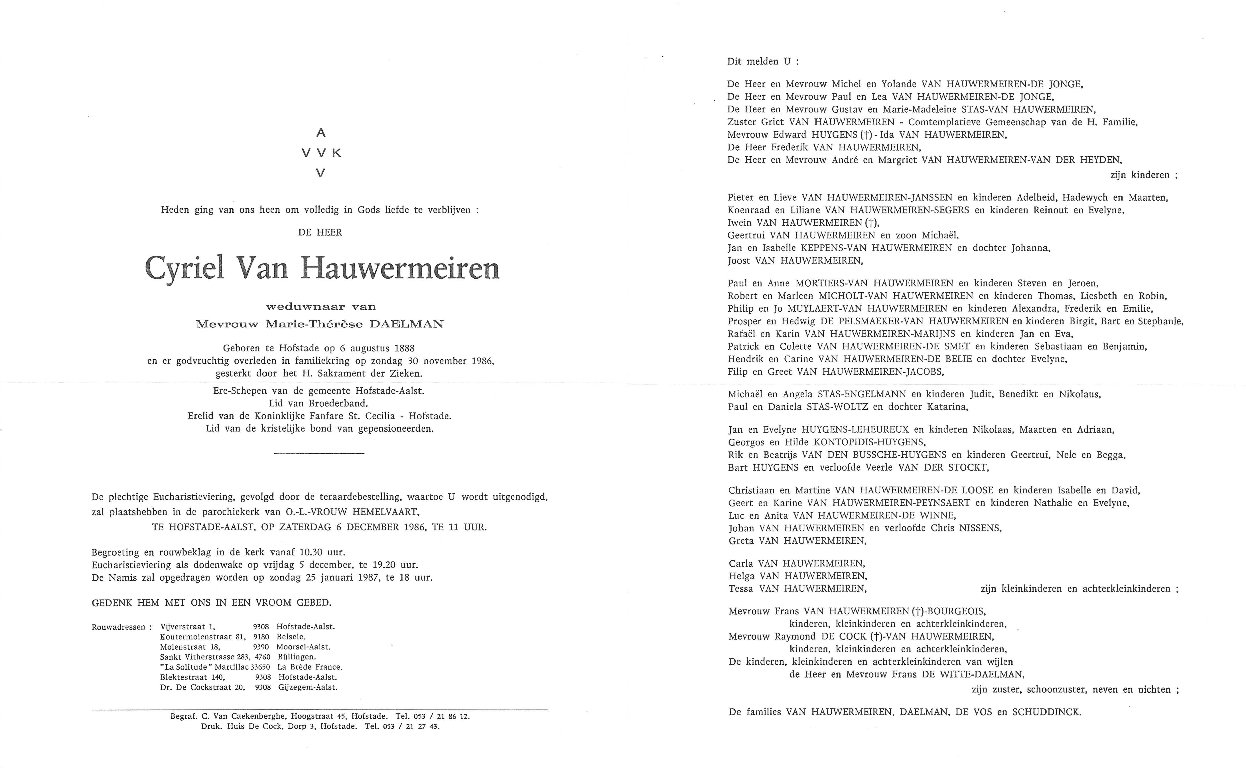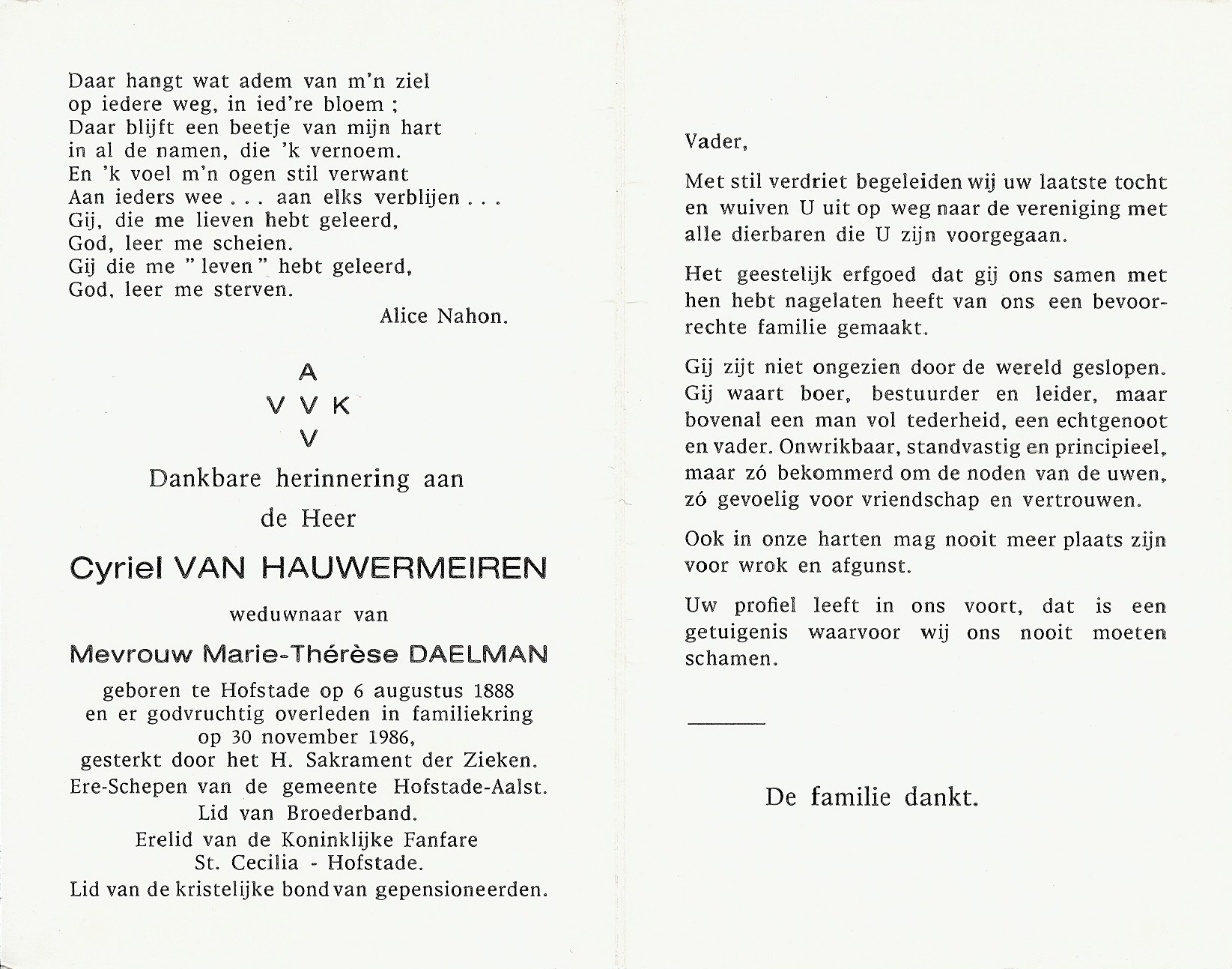 Franciscus Cyrillus Van Hauwermeiren Geboren: 6 augustus 1888 46 32 — Hofstade Overleden: 30 november 1986 — Hofstade |