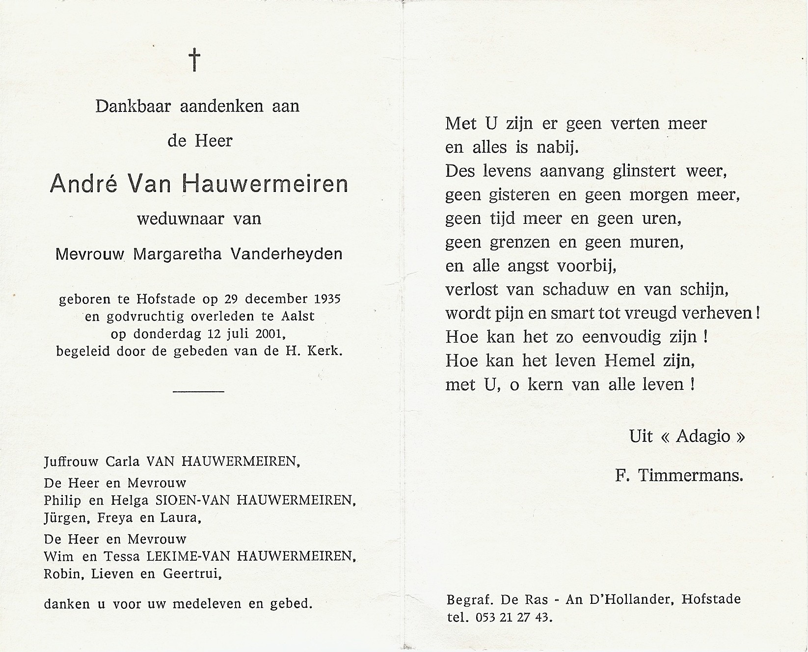 André Van Hauwermeiren Geboren: 29 december 1935 47 42 — Hofstade Overleden: 12 juli 2001 — Aalst |