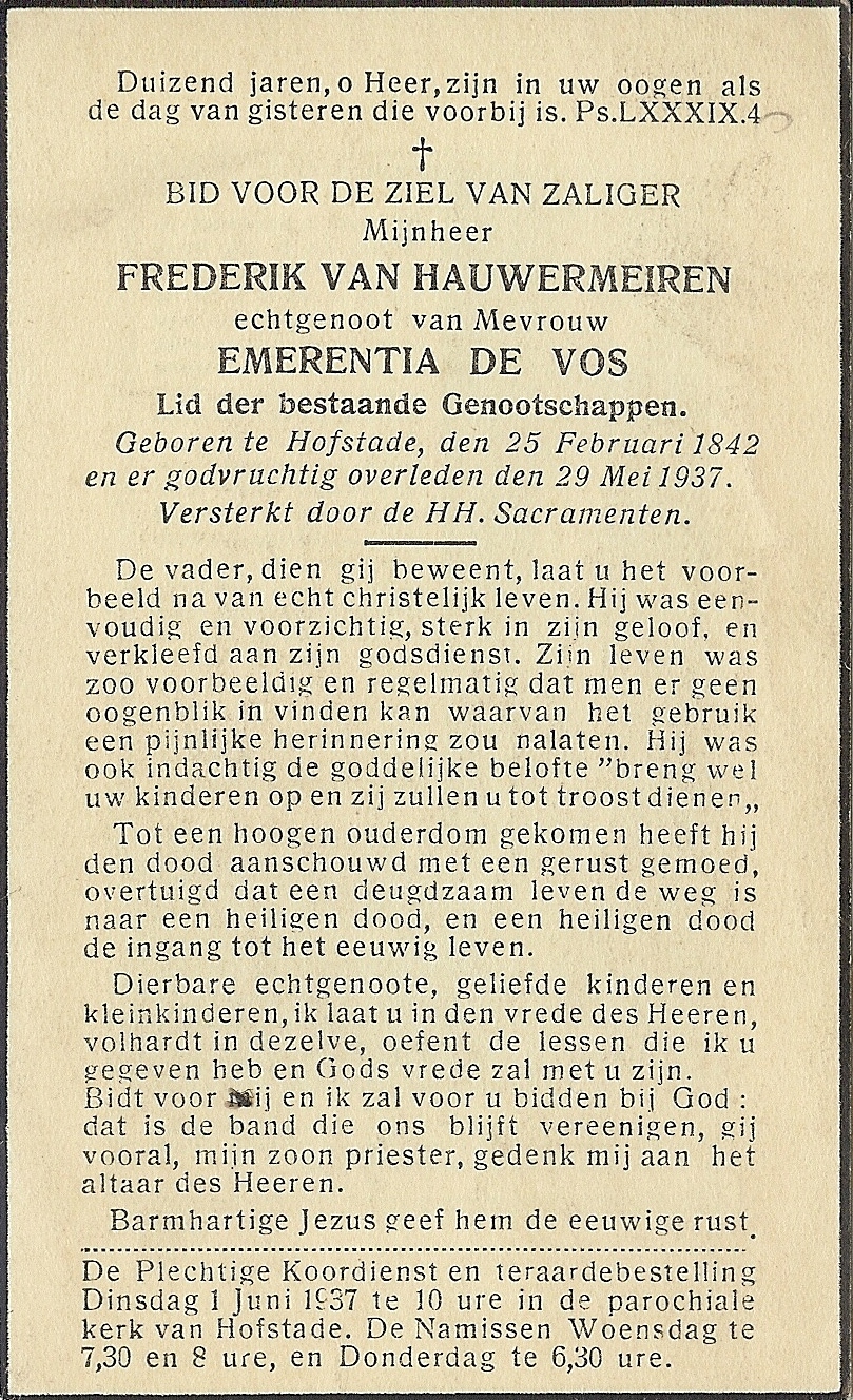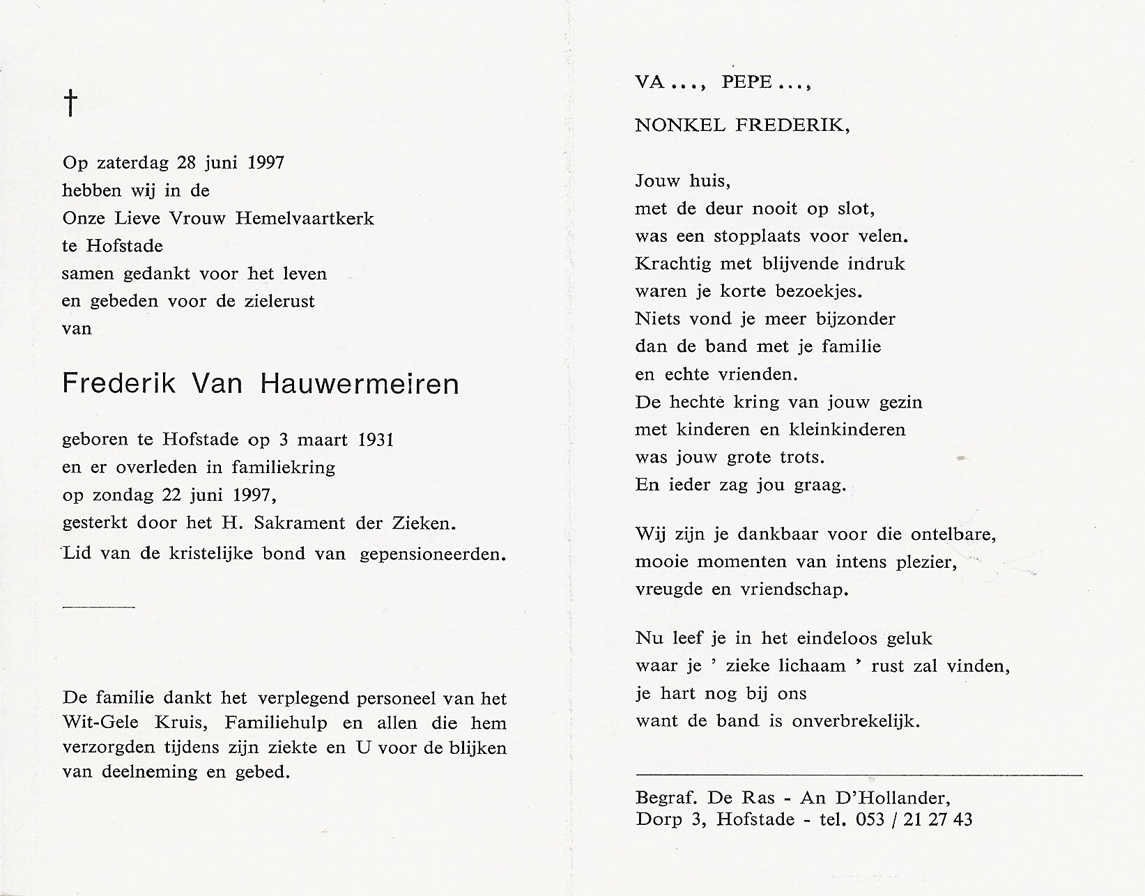 Frederik Van Hauwermeiren Geboren: 3 maart 1931 42 37 — Hofstade Overleden: 22 juni 1997 — Hofstade |