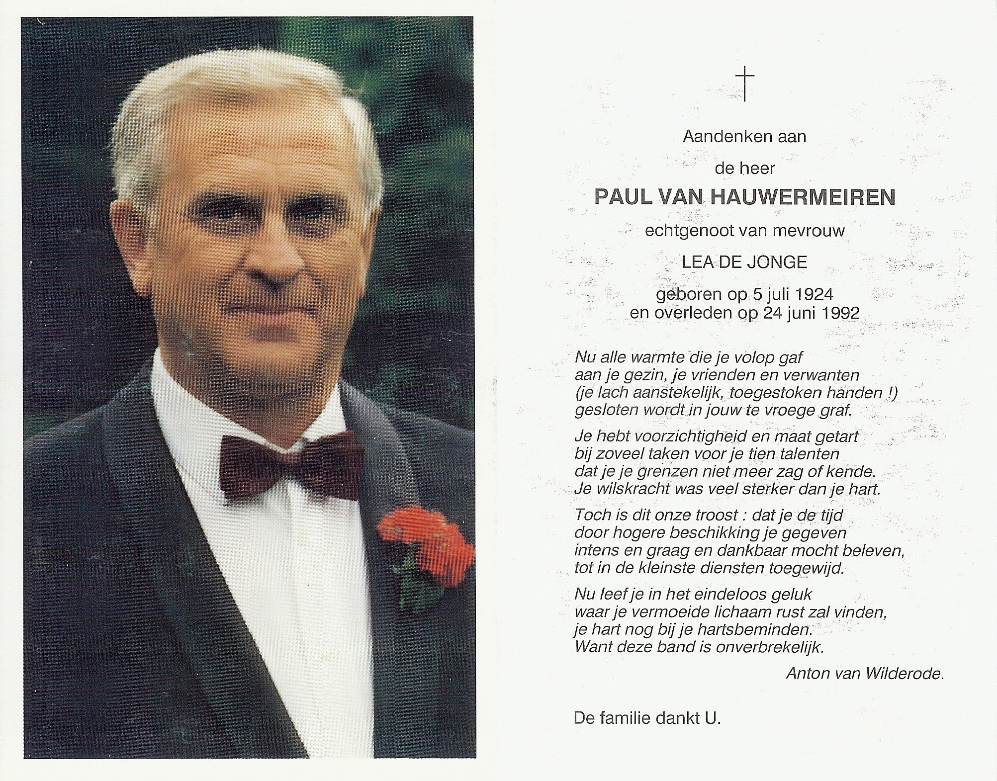 Begrafenis van een broer | Paul Van Hauwermeiren 30 juni 1992 (Leeftijd 62 jaar) |