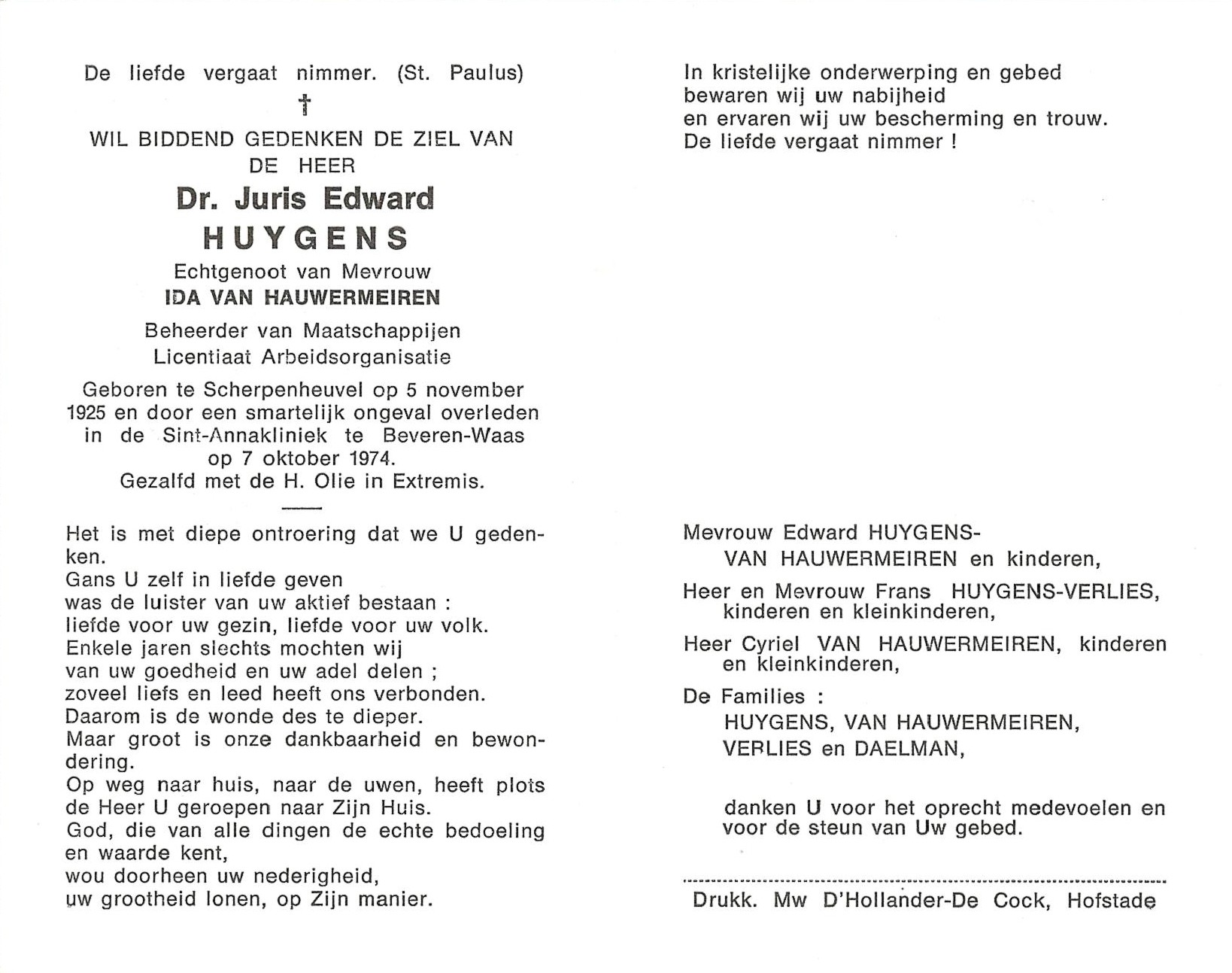 Juris Edward Huygens Geboren: 5 november 1925 — Scherpenheuvel Overleden: 7 oktober 1974 — Beveren |