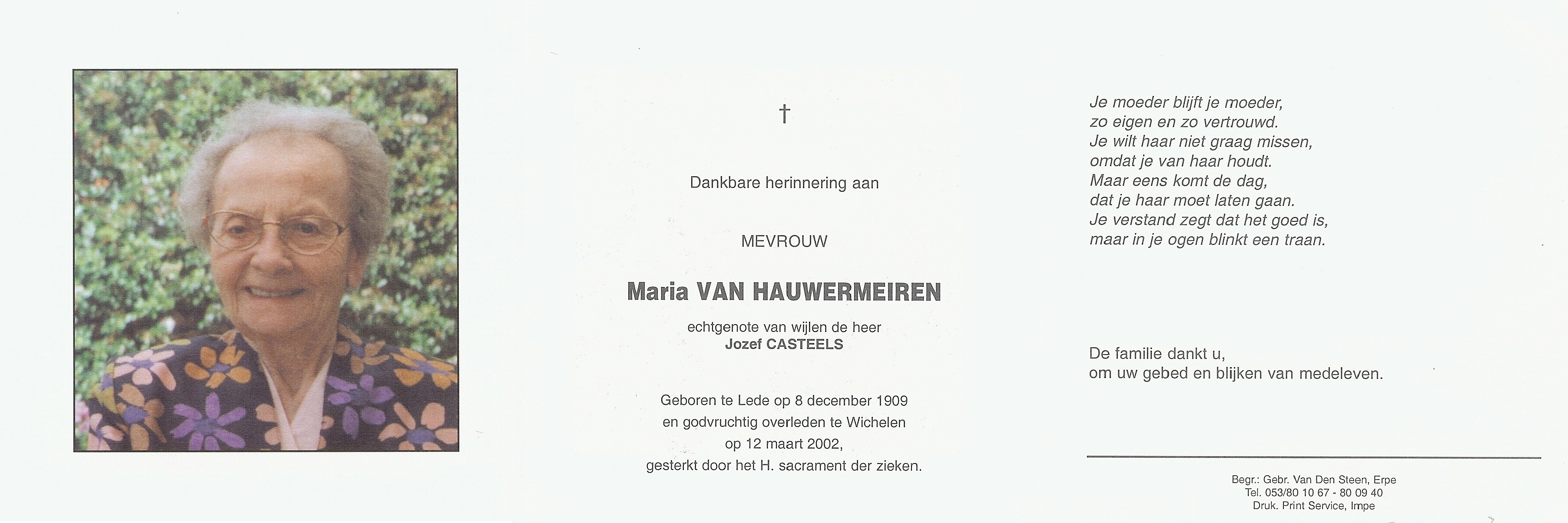 Maria Van Hauwermeiren Geboren: 8 december 1909 36 31 — Lede Overleden: 12 maart 2002 — Wichelen |