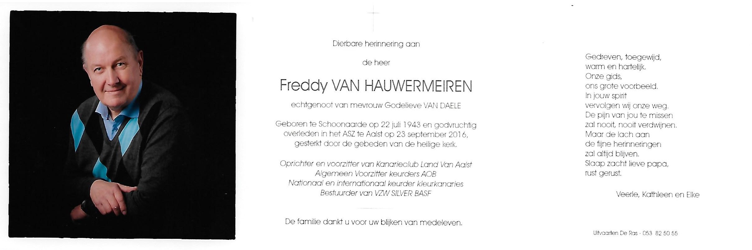 Freddy Jules Coleta Van Hauwermeiren Geboren: 22 juli 1943 26 24 — Schoonaarde Overleden: 23 september 2016 — Aalst |