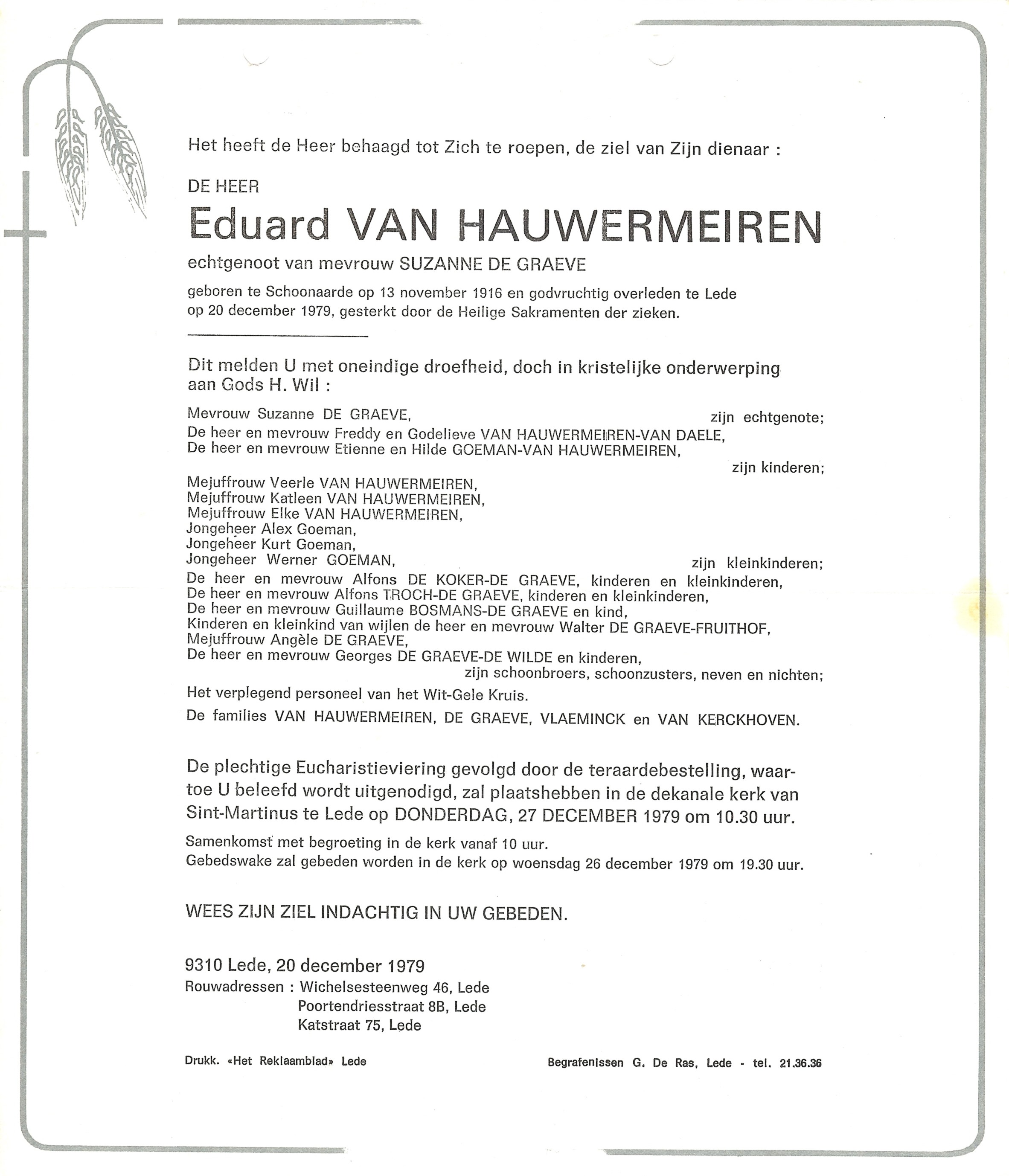 Begrafenis van vader | Eduardus Prudens Van Hauwermeiren 27 december 1979 (Leeftijd 36 jaar) |