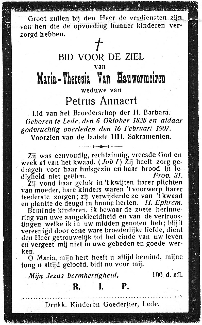 Maria Theresia Van Hauwermeiren Geboren: 6 oktober 1828 29 26 — Lede Overleden: 16 februari 1907 — Lede |